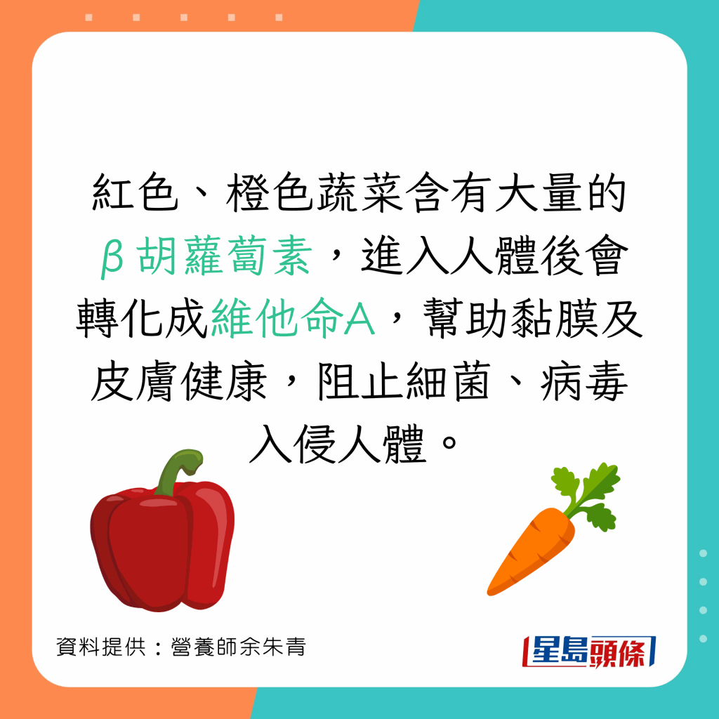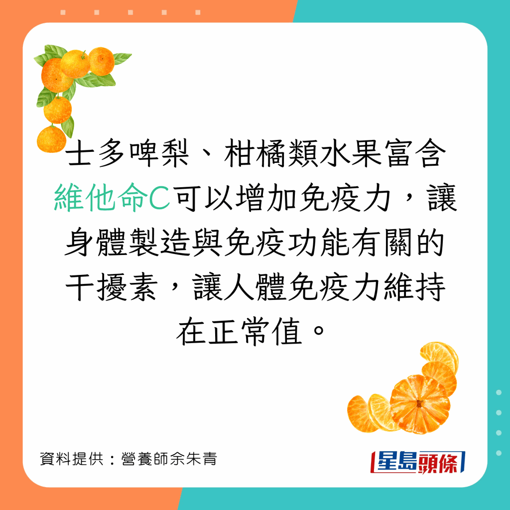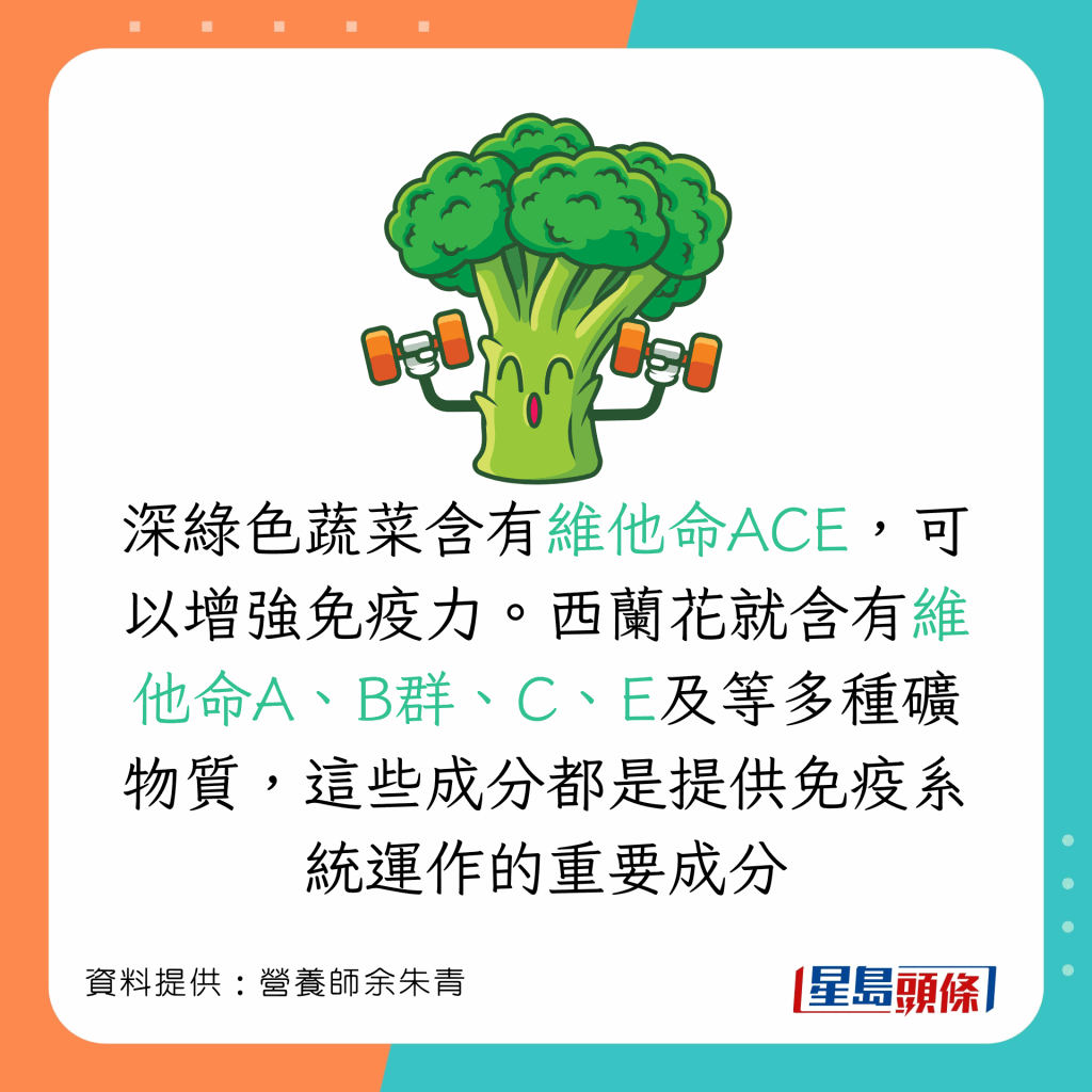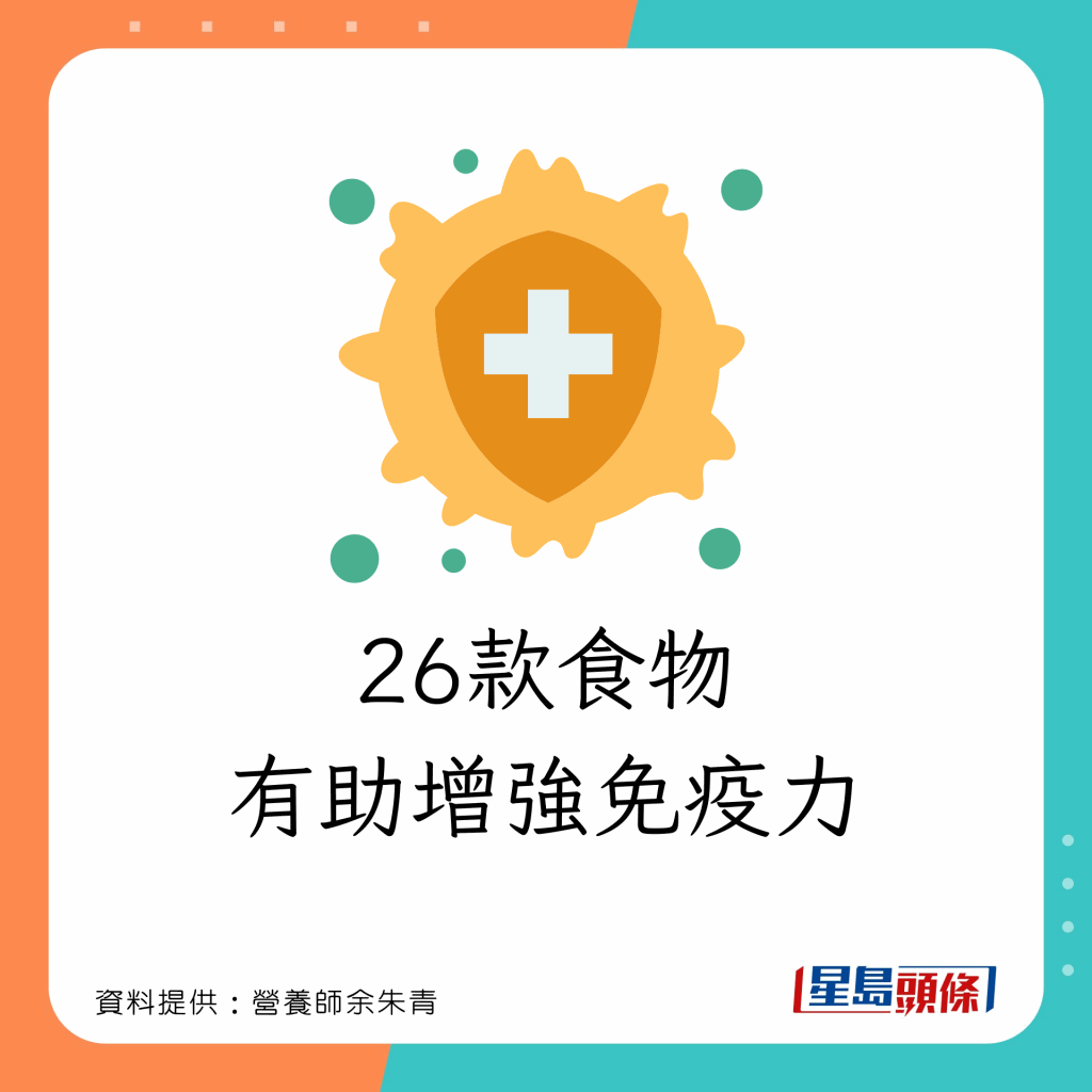 營養師余朱青在其Facebook專頁發文表示,若要對抗外在病毒和細菌,可從飲食方面增強自身免疫力,26款食物例子如下: