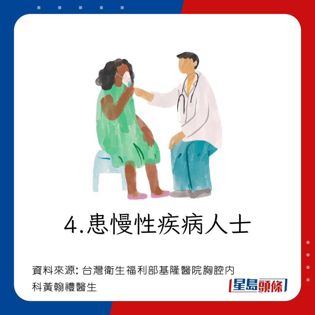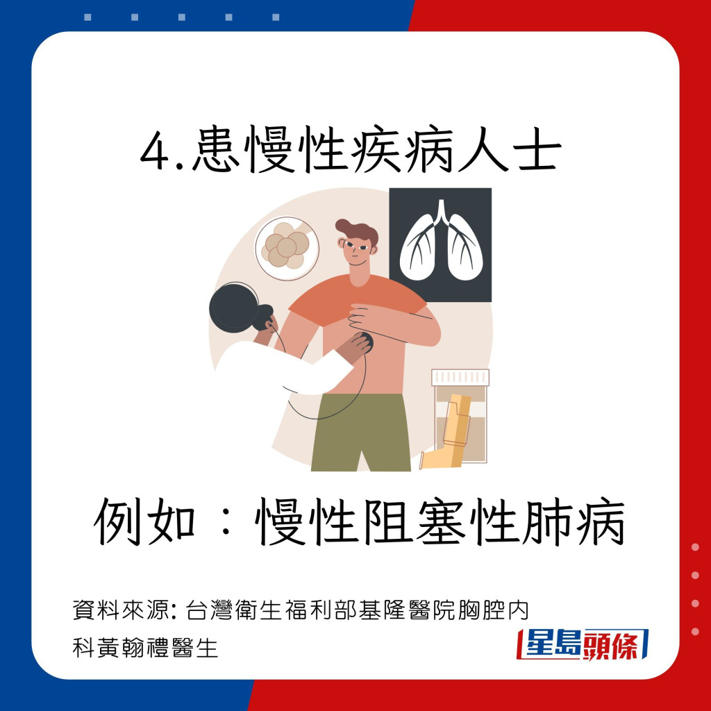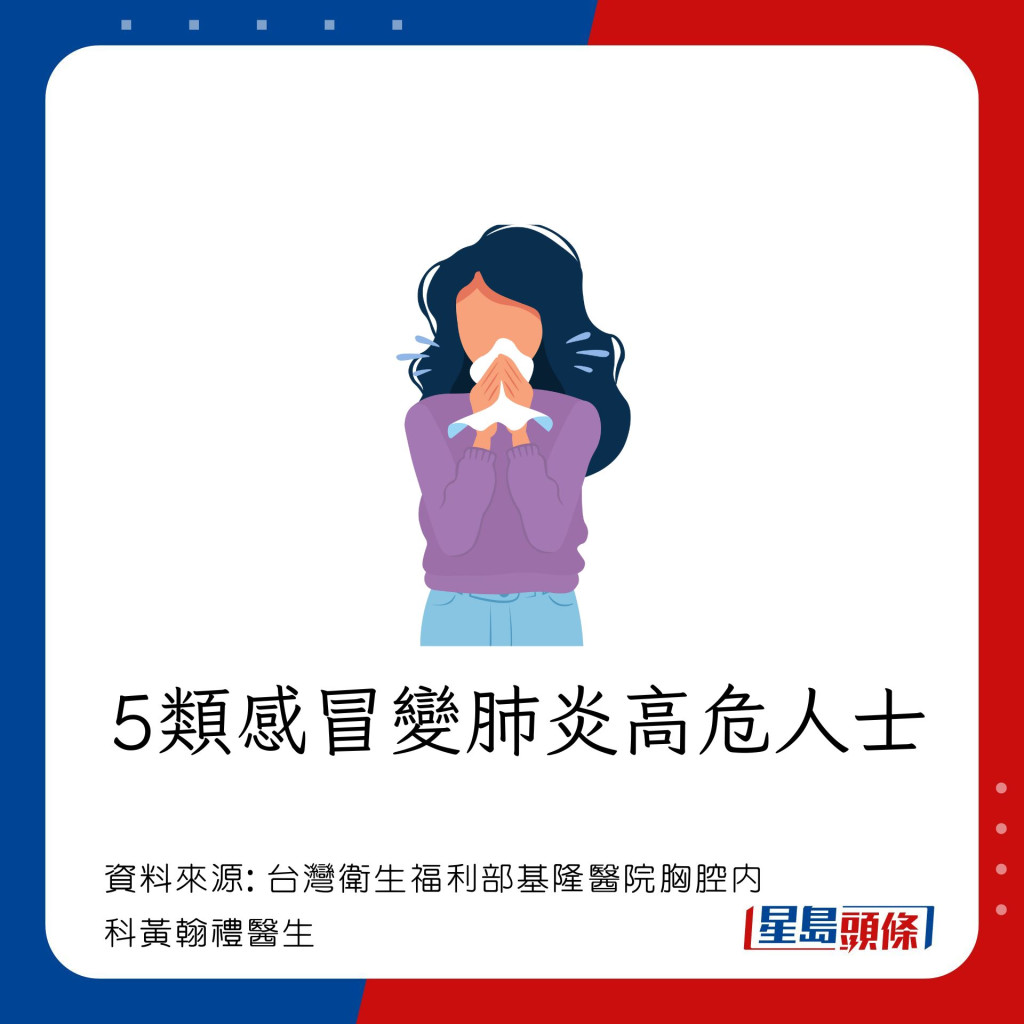 他指出在感冒季節期間,以下5類人不可對感冒掉以輕心,否則可引發輕度或重度的肺炎: