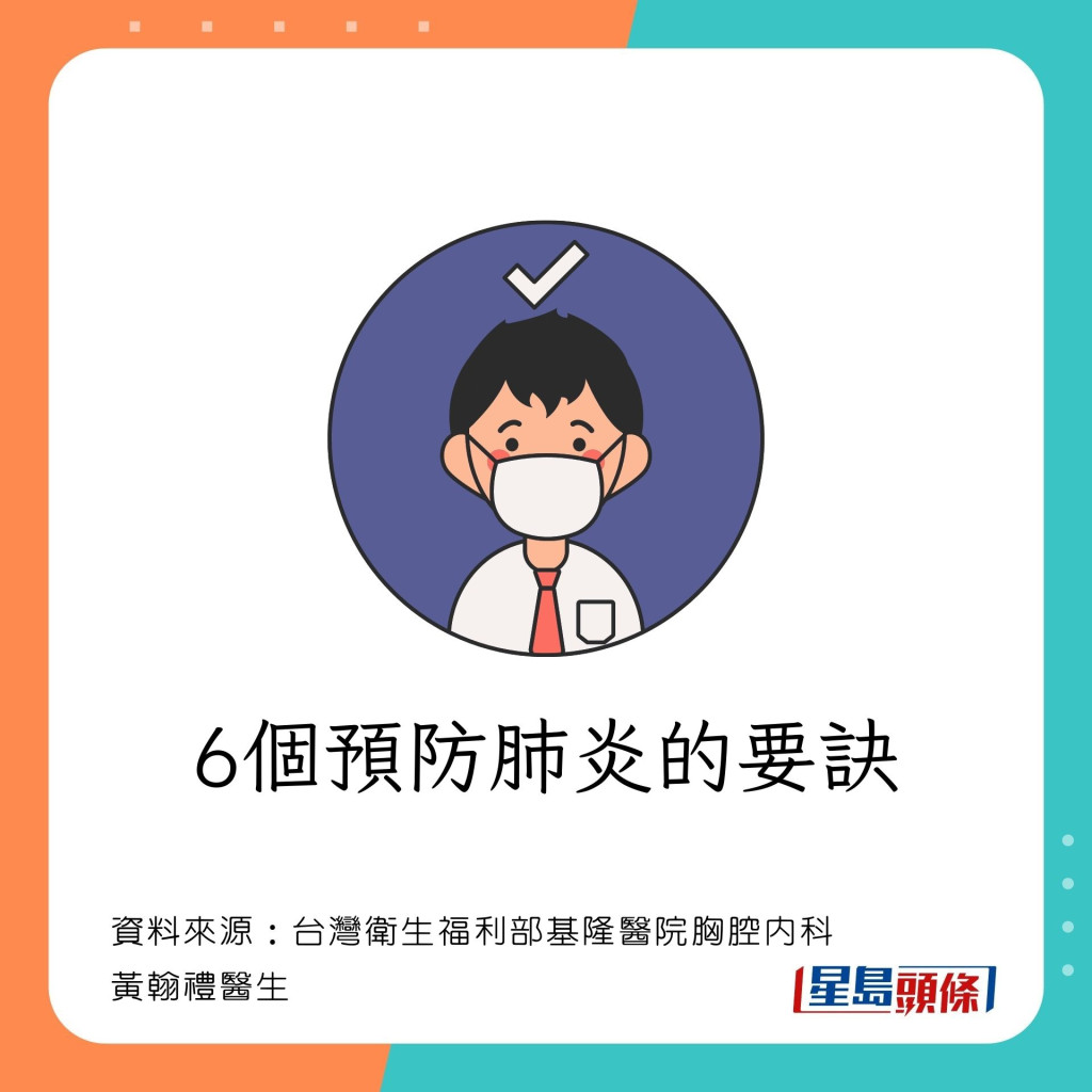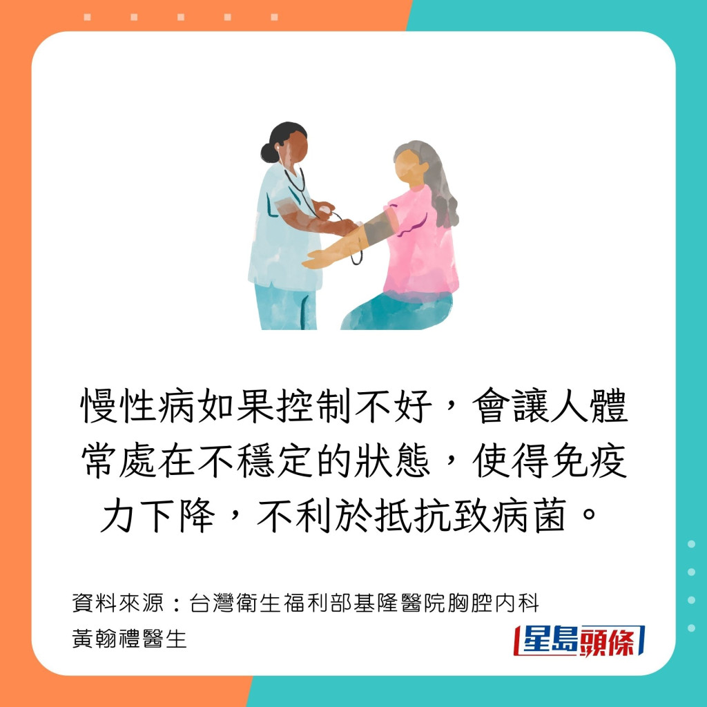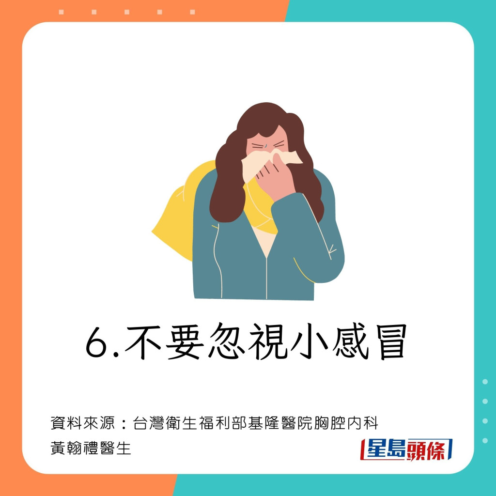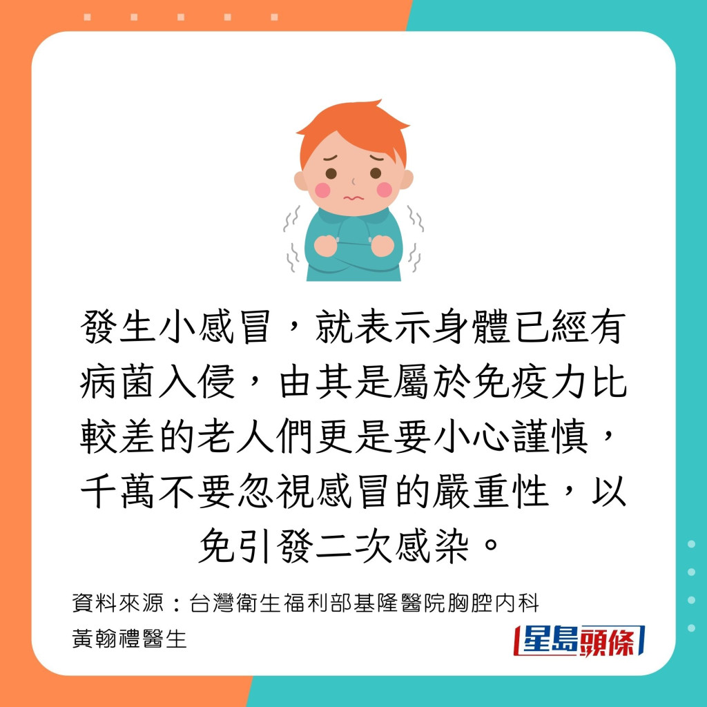 胸腔內科黃翰禮醫生曾指出,勿輕忽小感冒,因為肺炎是常見的感冒并發癥,感染會影響肺部擴張,對于長者或患有慢性病者來說是雪上加霜。因此應該多休息,不要等到出現呼吸急促或咳到胸痛等癥狀才求醫。