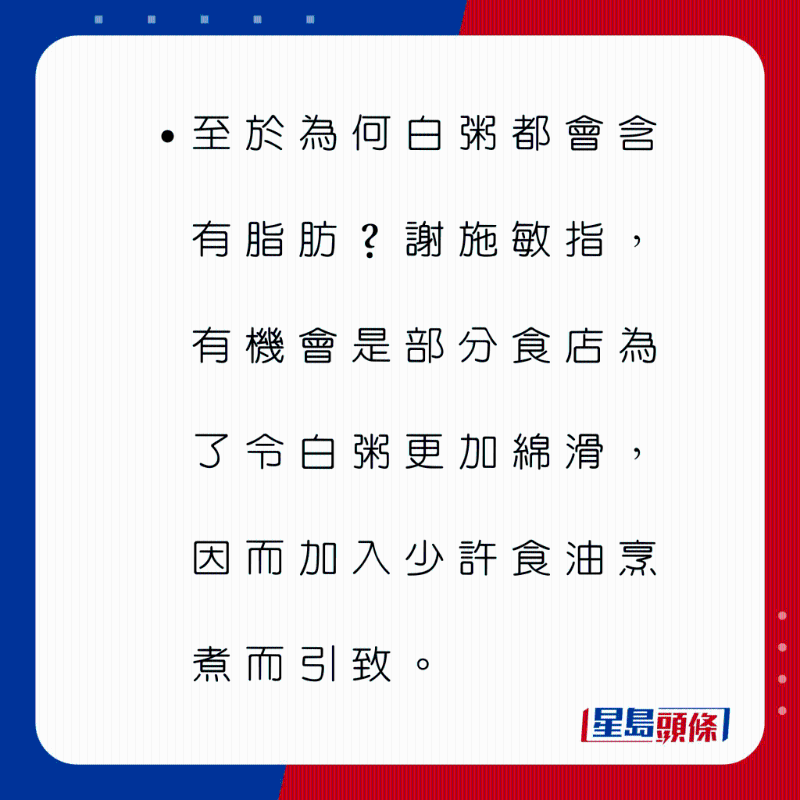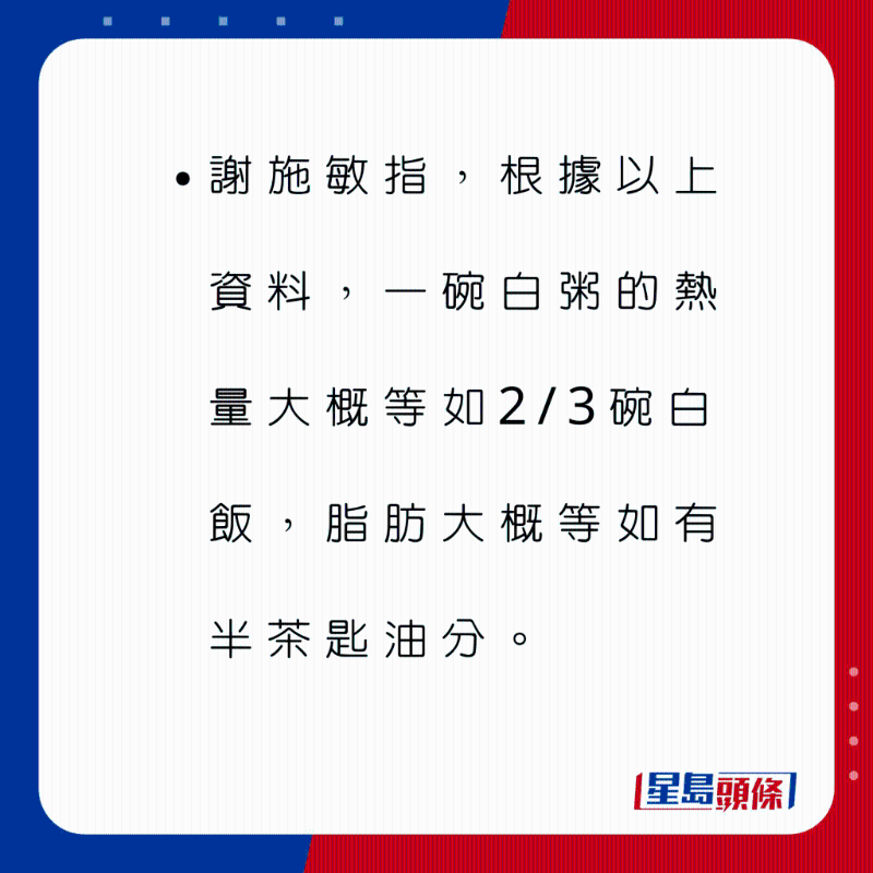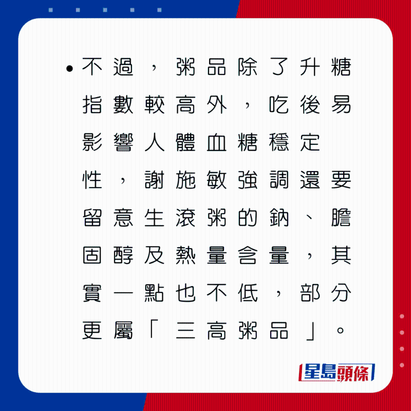 “家營營養中心”營養師謝施敏特提醒大家,最好避開或少食“三高粥品”,而當然最理想是在家自煮,故謝施敏教大家如何智選外,還會教煮高纖低升糖指數的健怡粥品。