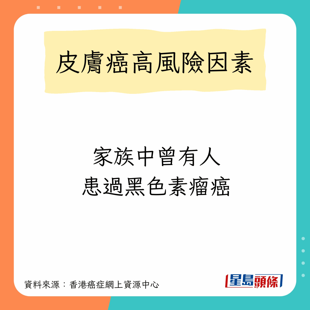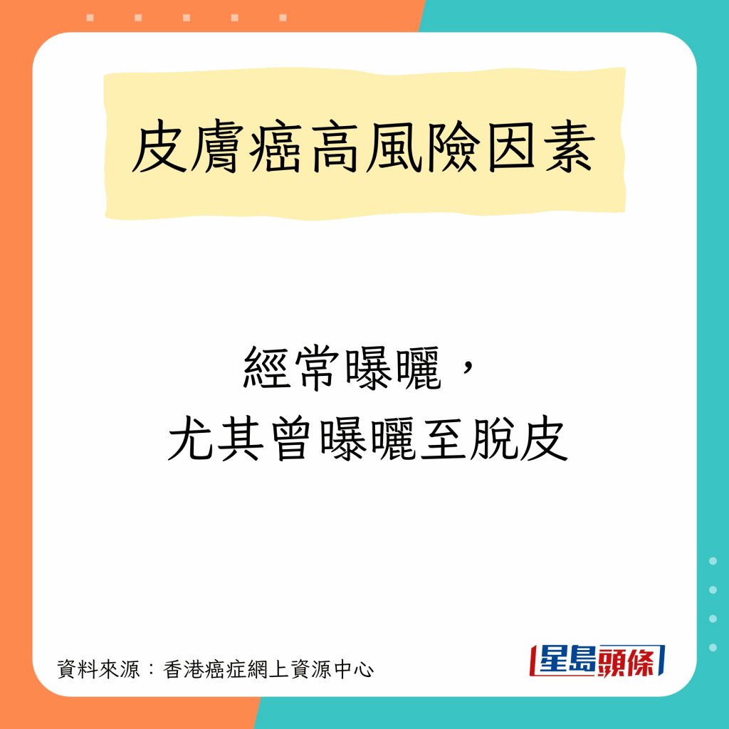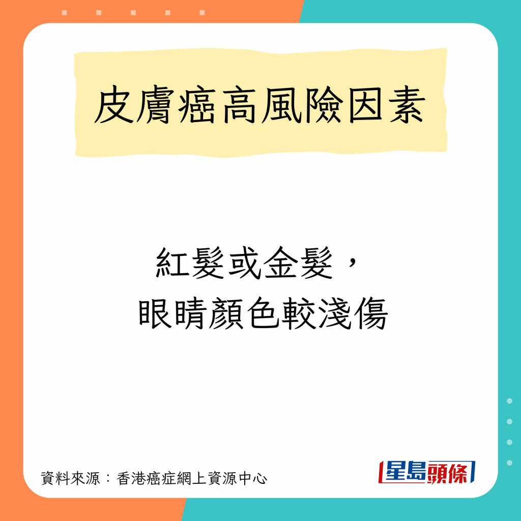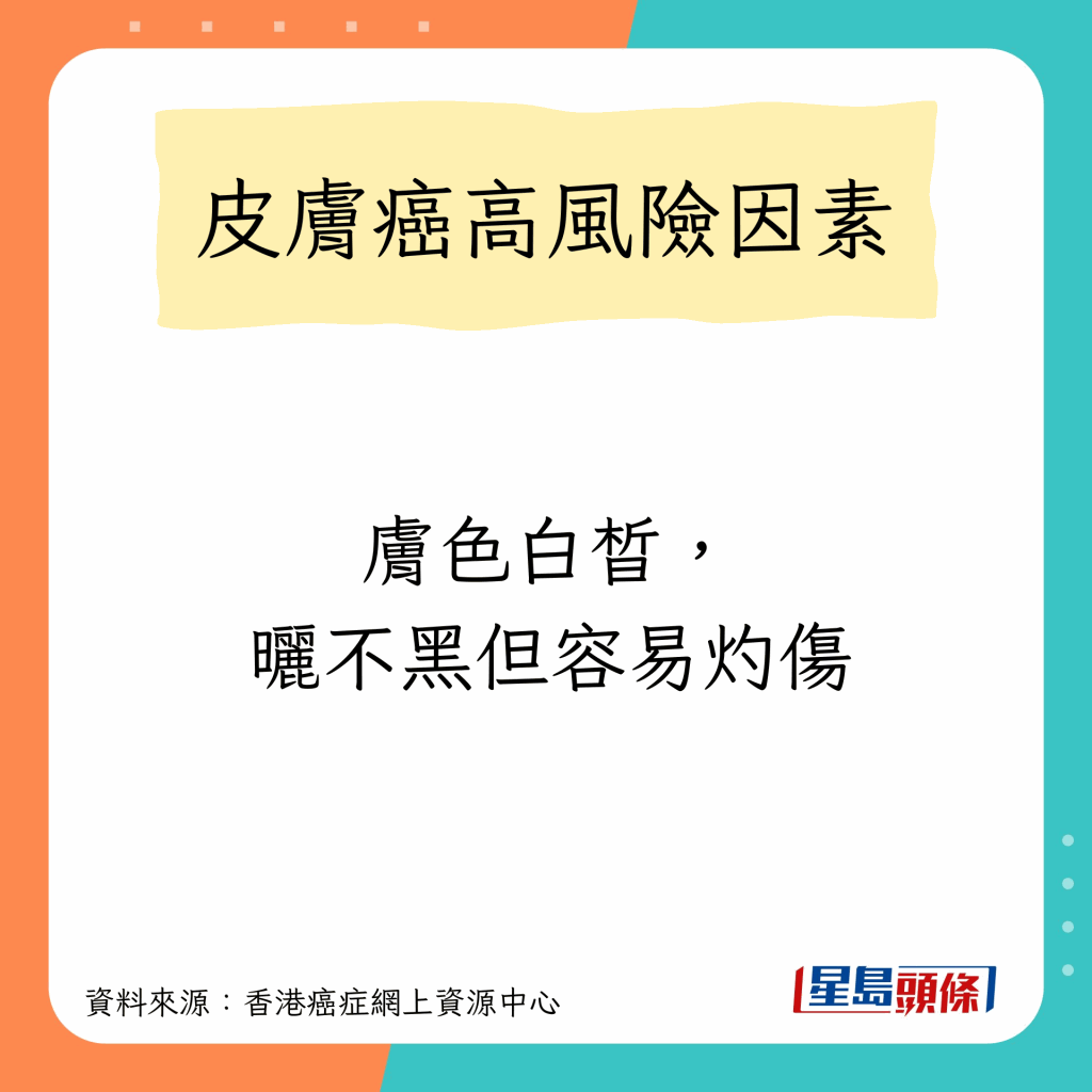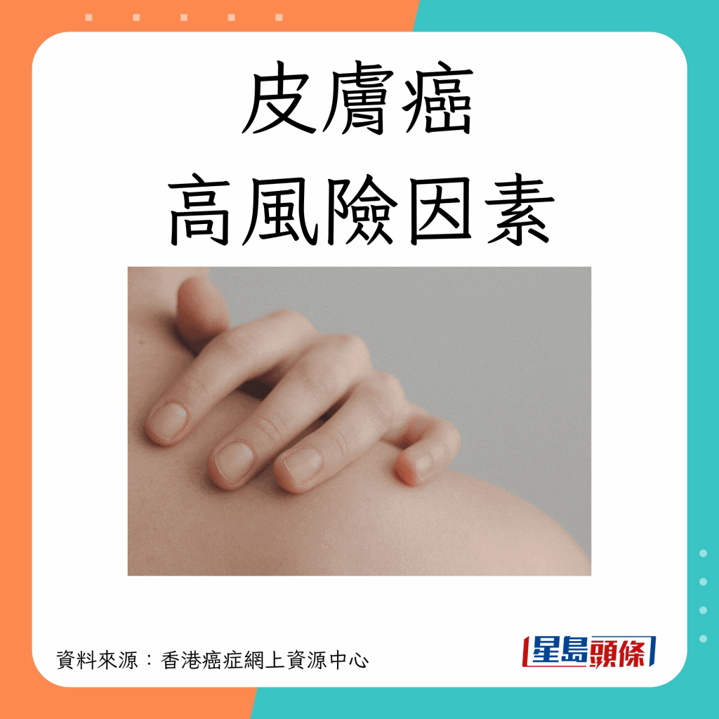 香港癌癥網上資源中心指,任何膚色的人都可能患上皮膚癌,高風險因素包括以下10種: