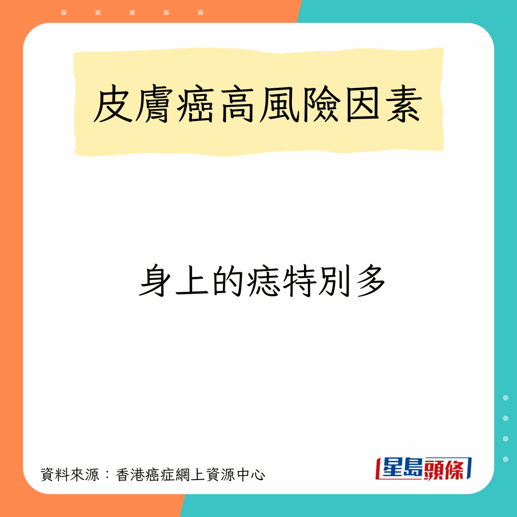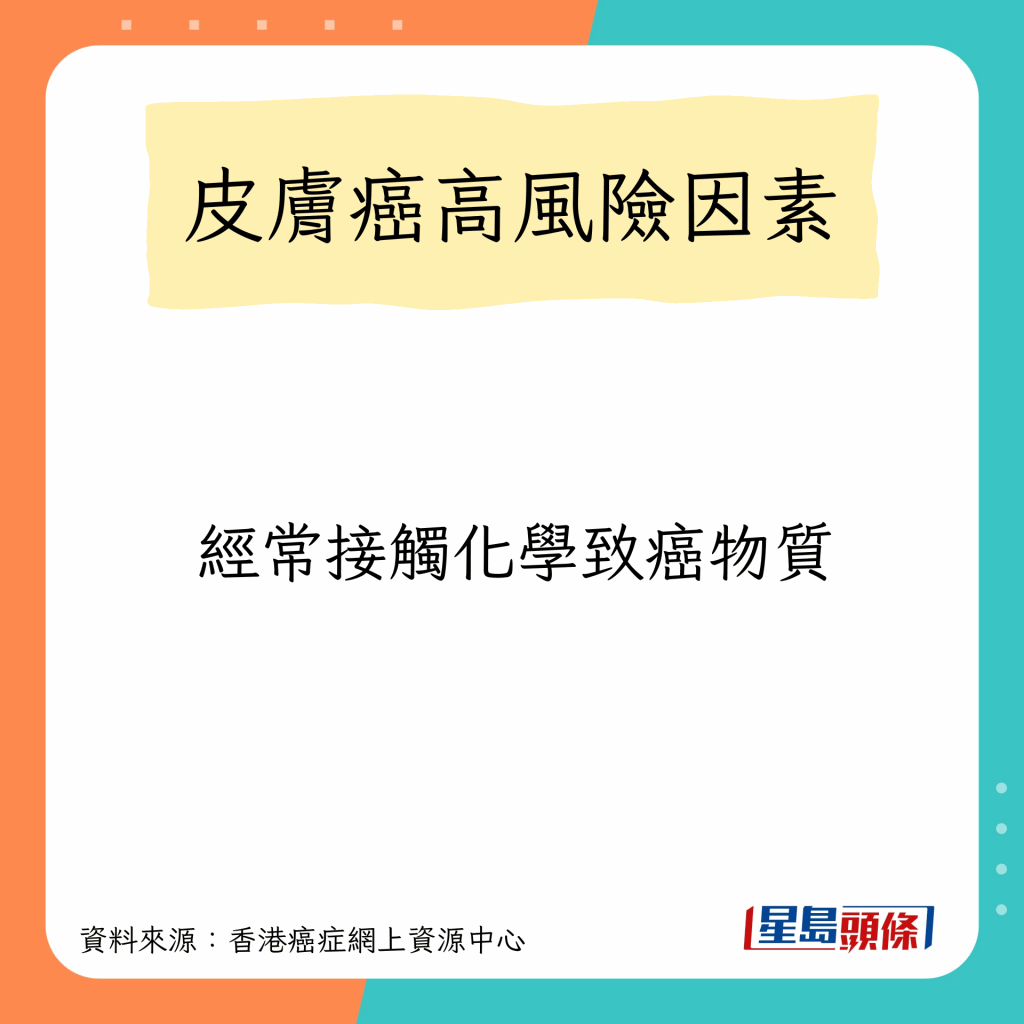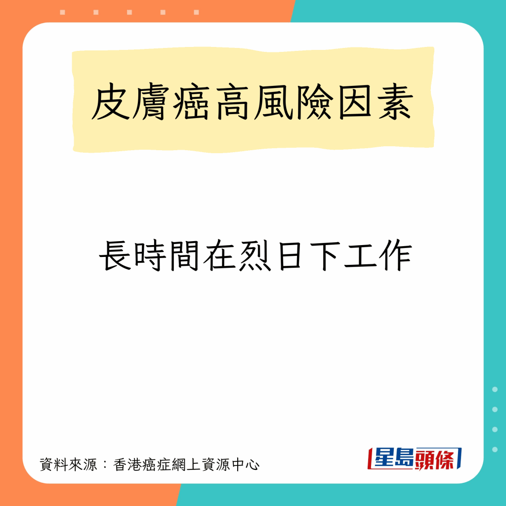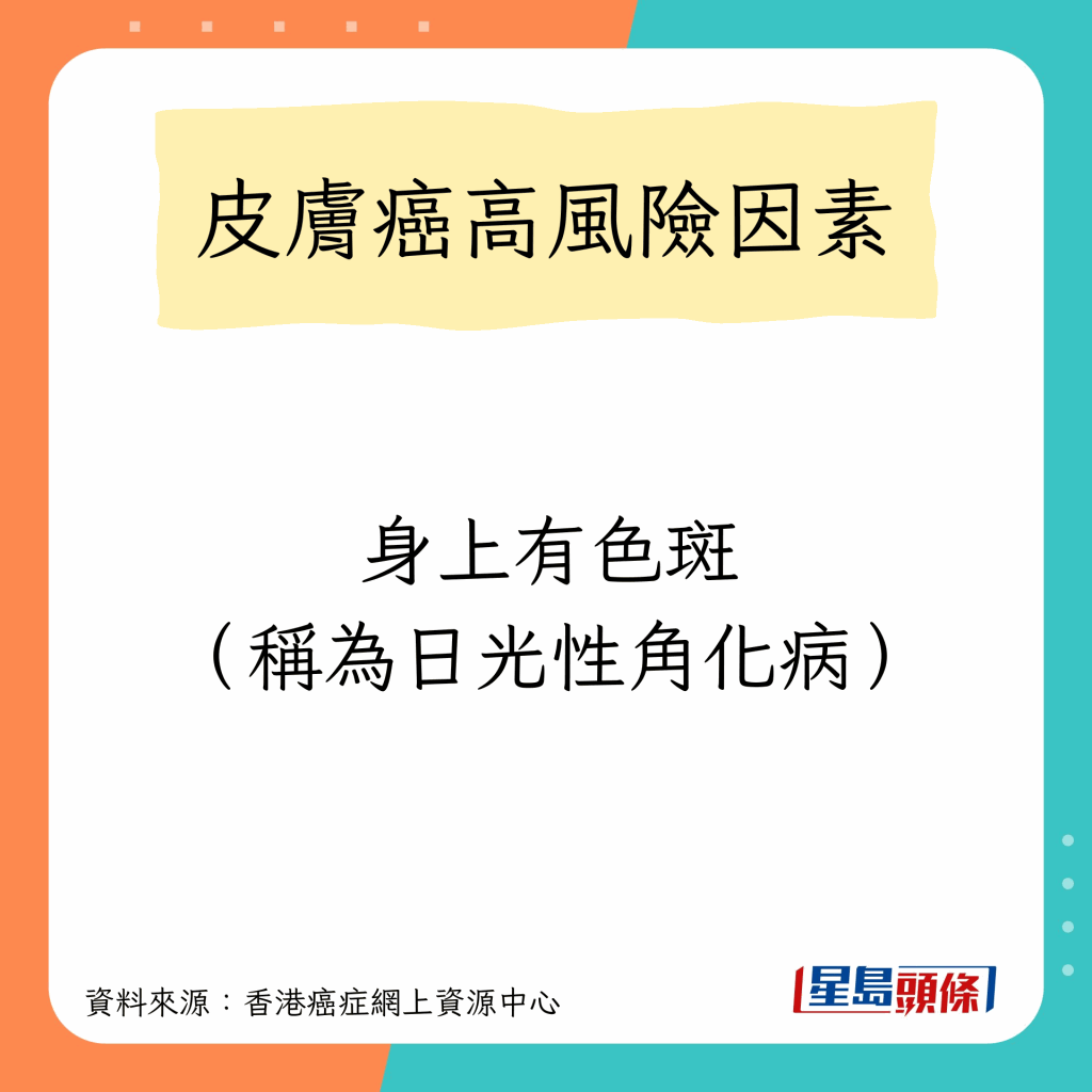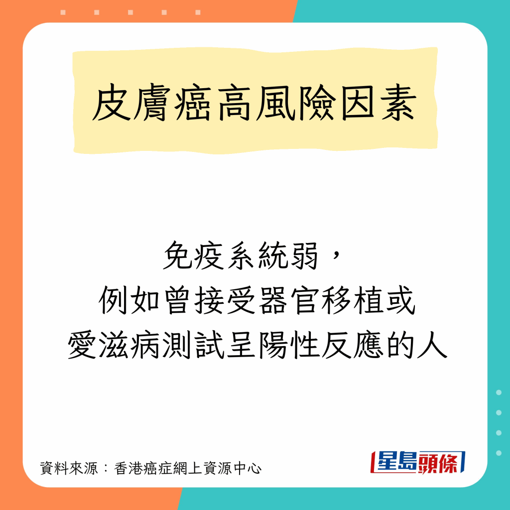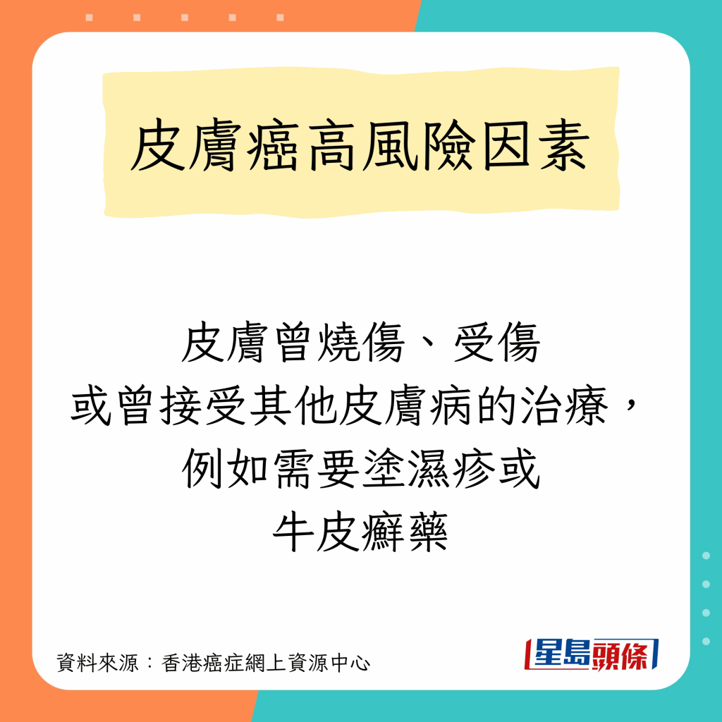 香港癌癥網上資源中心指,任何膚色的人都可能患上皮膚癌,高風險因素包括以下10種: