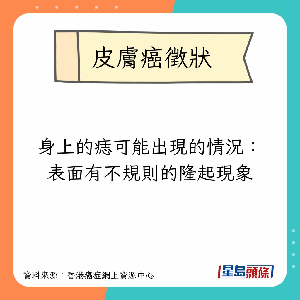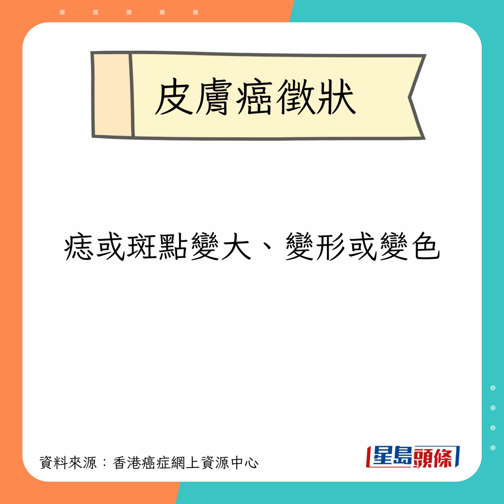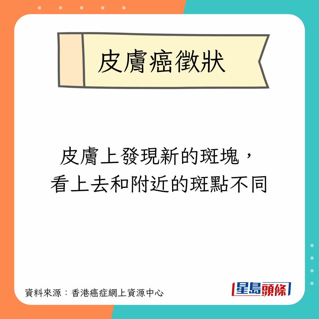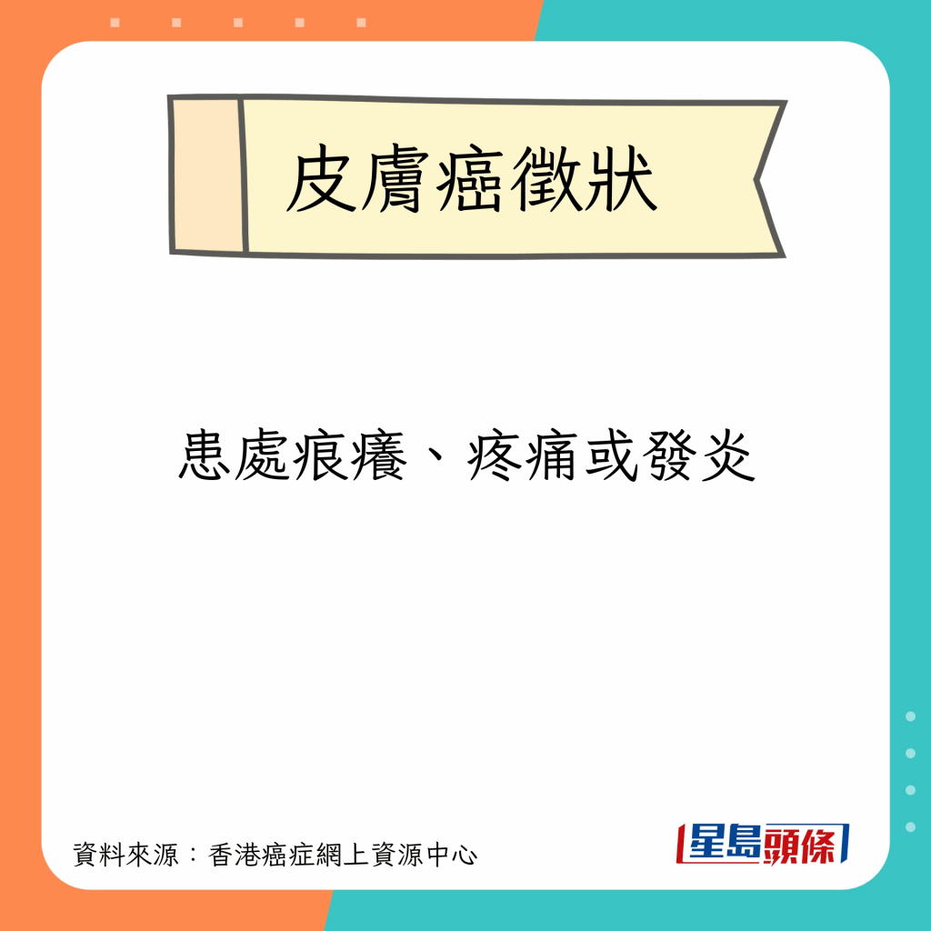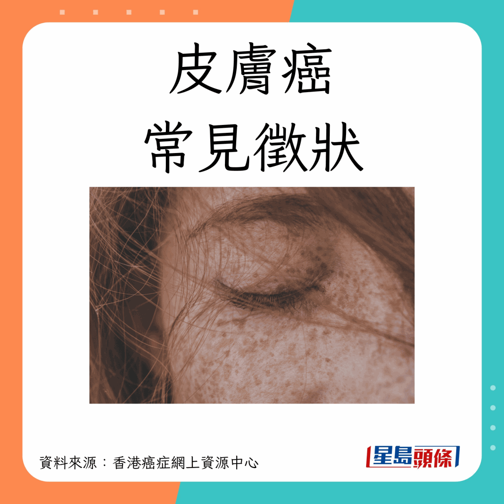 香港癌癥網上資源中心指,不同種類的皮膚癌有不同的征狀,比較常見的征狀包括以下9種: