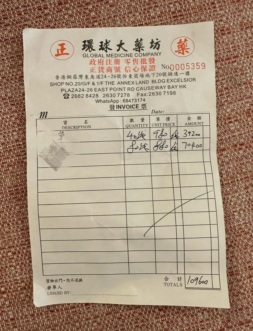 根據女游客發到網上的圖片,可以看到一張環球大藥坊發票單據列明兩種藥材,一款每錢980元的藥材,共40錢重;另一款每錢880元共80錢重,兩樣合共收取109600元,不過藥材名稱被打碼遮蓋。