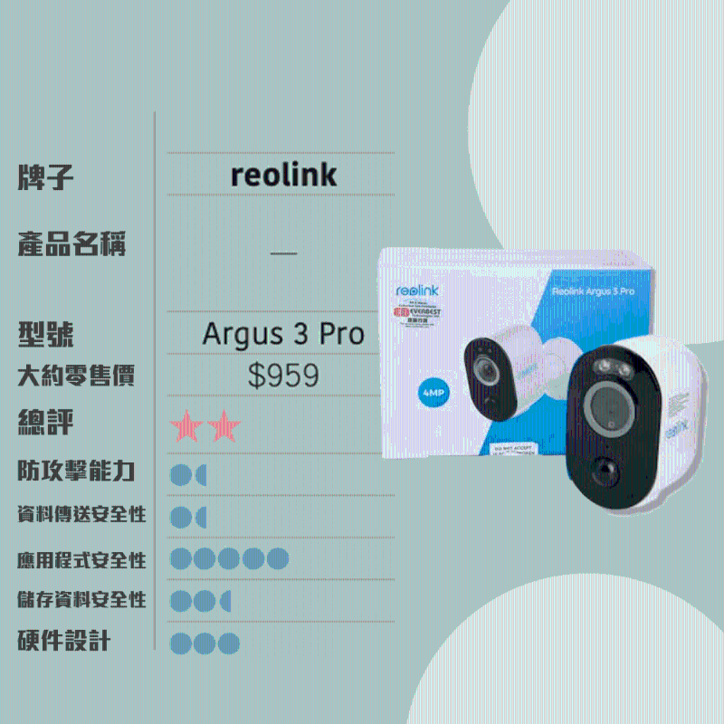 另外1款樣本(reolink)連接用家Wi-Fi時,使用“超文本傳輸協定”(HTTP)傳送資料,沒有把敏感資料加密,駭客可以從普通文字檔找到路由器的帳戶資料。若生產商改用安全性較高的“超文本傳輸安全協定”(HTTPS),可為用戶提供更大的私隱保障。