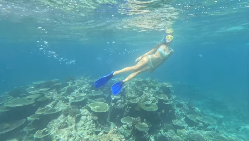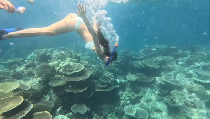▲任晴佳身穿三點式潛水,盡曬42吋長腿及纖腰。
