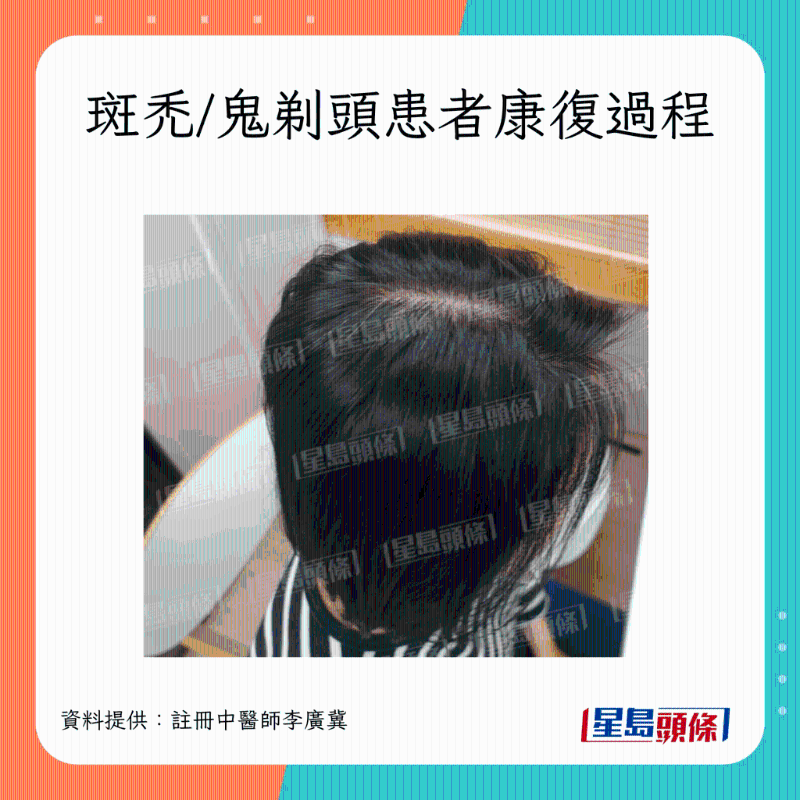 注冊中醫師李廣冀接受《星島頭條》訪問指,該名37歲女子疑壓力大,于2年半前開始脫發。 初期她先是出現一小塊斑禿(鬼剃頭),范圍約為2至3cm大。 惟事隔1年后,范圍擴大,她接種新冠疫苗后,脫發范圍大至8cm x 8cm。 雖曾接受治療,但未見明顯好轉; 2個月后,更出現新病灶,有新位置出現斑禿(鬼剃頭)情況。 但她眉毛、眼睫毛、體毛正常,未見脫落。