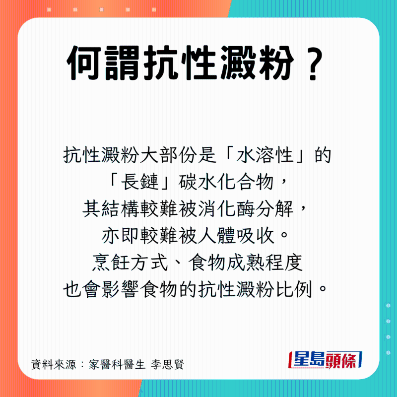 家醫科醫生李思賢在其facebook專頁發文指,用1種方法處理淀粉類食物后,可增加食物的抗性淀粉(resistant starch),可延長飽肚感、穩定血糖。何謂抗性淀粉?抗性淀粉大部份是“水溶性”的“長鏈”碳水化合物,其結構較難被消化酶分解,亦即較難被人體吸收。