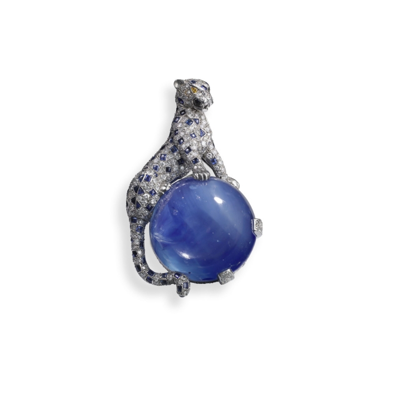 ▲美洲豹夾式胸針,卡地亞巴黎,1949 年。鉑金、白金、鉆石、藍寶石??ǖ貋喌洳?。 來源:溫莎公爵夫人(1896–1986年)Vincent Wulveryck, Collection Cartier ?Cartier