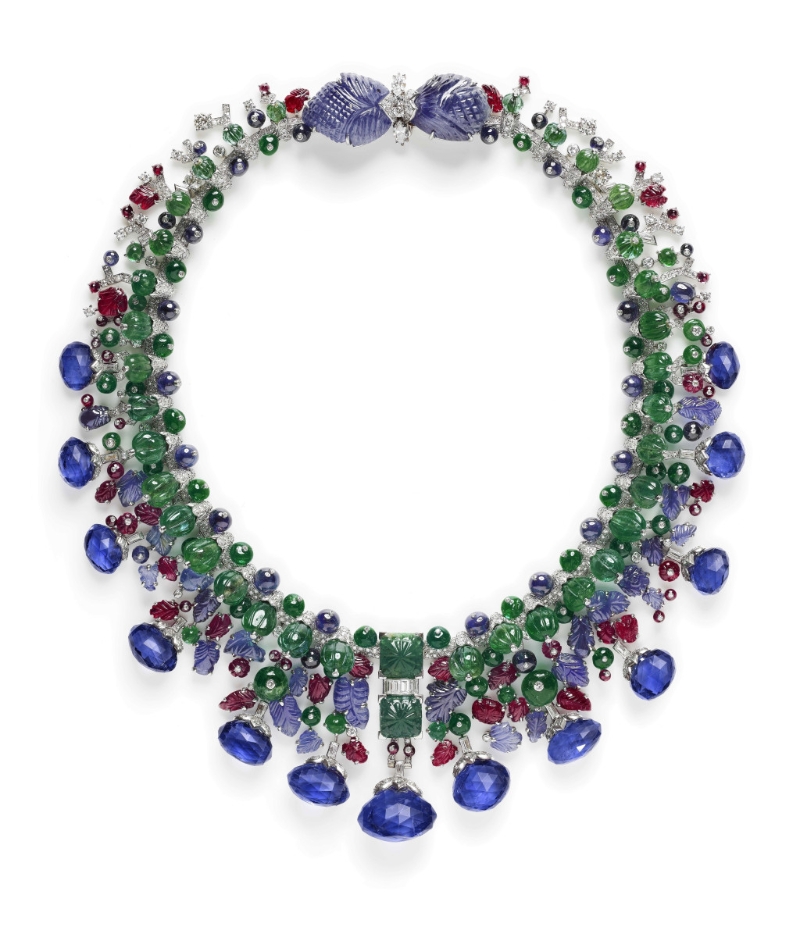 ▲印度風格項鏈??ǖ貋啺屠?,1936年制作,1963年改款。鉑金、白金、鉆石、藍寶石、祖母綠、紅寶石。特別訂制,卡地亞典藏。來源:黛絲.法羅斯(1890–1962年),勝家衣車公司繼承人。Vincent Wulveryck, Collection Cartier ?Cartier