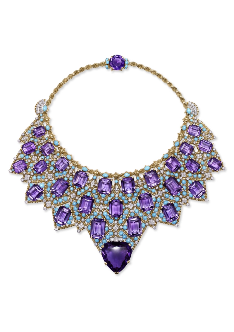 ▲項鏈??ǖ貋啺屠?,1947年。金、鉑金、鉆石、紫水晶、綠松石。特別訂制,卡地亞典藏。來源:溫莎公爵夫人(1896–1986年)Nils Herrmann, Collection Cartier ?Cartier