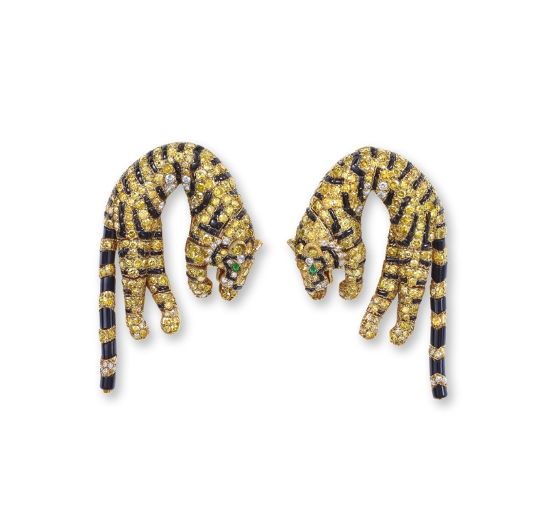 ▲虎形耳夾(一對)??ǖ貋啺屠?,1961年。金、鉆石、祖母綠、縞瑪瑙。特別訂制,卡地亞典藏。來源:芭芭拉.赫頓(1912–1979年), 美國零售商伍爾沃斯百貨繼承人。Nils Herrmann, Collection Cartier ? Cartier