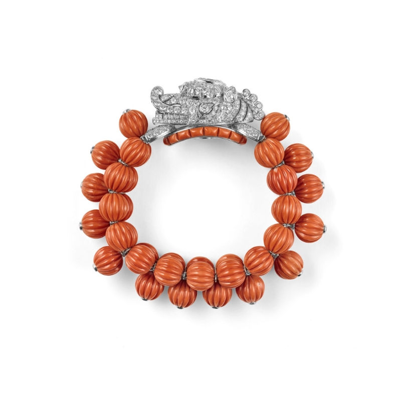 ▲瑞獸手鐲??ǖ貋啺屠?, 1954年。鉑金、白金、鉆石、珊瑚。特別訂制,卡地亞典藏。Nils Herrmann, Collection Cartier ?Cartier