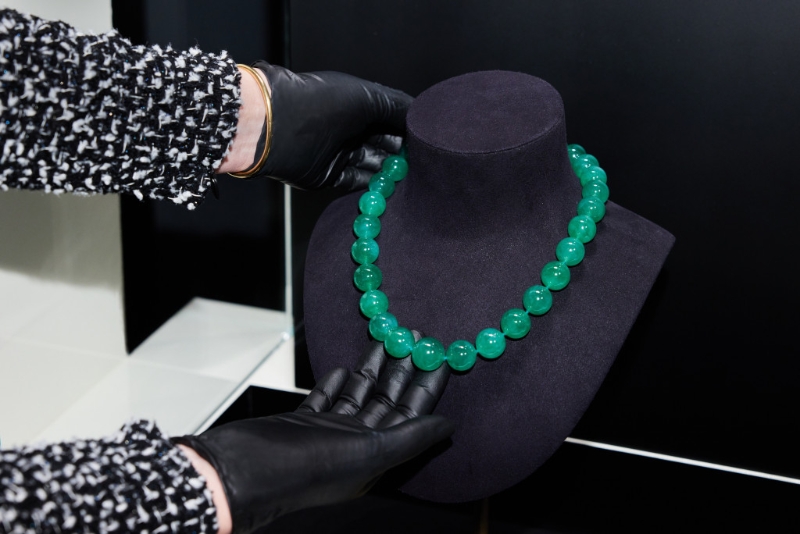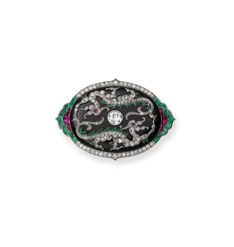 卡地亞于1919年制作其歷史上第一件帶中國道家太極紋飾“陰陽”的鏈墜;法國高級訂制時裝設計師珍妮.派昆(Jeanne Paquin ,1869–1936年)于1920年獲贈飾有中國傳統紋樣“雙龍戲珠”的卡地亞胸針;美國社交與時尚界名媛芭芭拉.赫頓(Barbara Hutton,1912–1979年)于1933年結婚時獲贈的卡地亞項鏈,其所用的翡翠,正是中國人喜愛的名貴寶石。