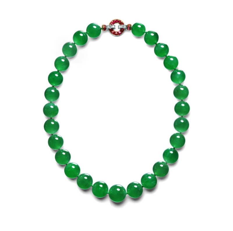 ▲項鏈??ǖ貋啺屠?,1934年。翡翠、鉑金、金、鉆石、紅寶石。特別訂制,卡地亞典藏。來源:芭芭拉.赫頓(1912–1979年),美國零售商伍爾沃斯百貨繼承人。Marian Gérard, Collection Cartier ?Cartier