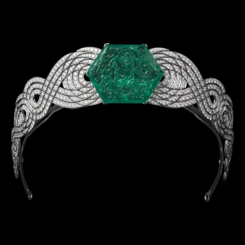 ▲泰姬陵祖母綠冠冕(可拆分為胸針)??ǖ貋?,2012年 鉑金、鉆石、祖母綠。女企業家何超瓊惠借。Vincent Wulveryck ?Cartier