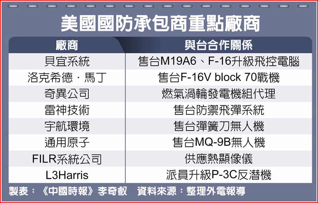 美商洛馬、雷神公司等均參加;其中,洛馬是美臺軍售最重要的供應商,多年前便取代華德公司成為臺灣軍火界的龍頭。