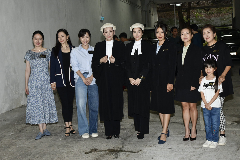 陳靜(左三)配合角色穿上恤衫牛仔褲現身,打扮樸素