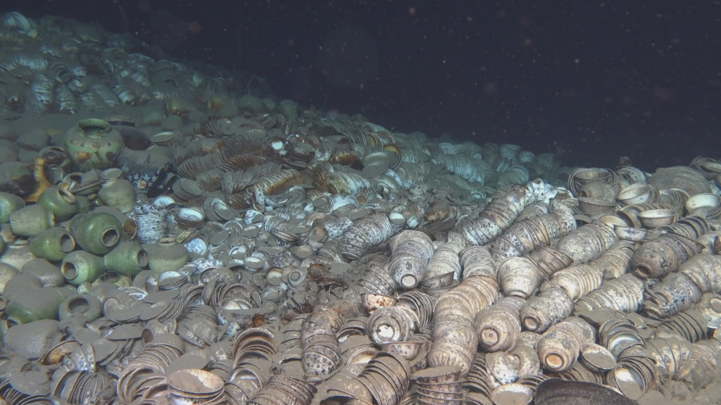 其中一處定名為南海西北陸坡一號沉船,有多個疑似被船艙分隔開的成堆文物,最大高度達3米多,文物以瓷器為主,散落范圍達上萬平方米,推測數量超過十萬件,根據出水文物初步判斷為明代正德年間(1506-1521)。另一處定名為南海西北陸坡二號沉船,發現大量原木,尺寸相近、碼放整齊,大多經過簡單加工,初步研判是從海外裝載貨物駛往中國的古代沉船,初步判斷為明代弘治年間(1488-1505)。