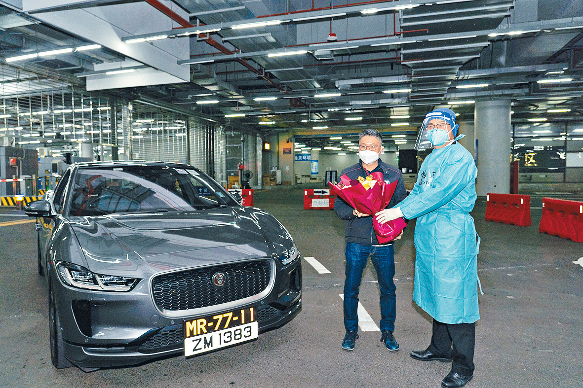 ▲不少“澳車北上”車主在社交平臺分享“避雷”情報,圖為海關關員為首名“澳車北上”車主獻花。
