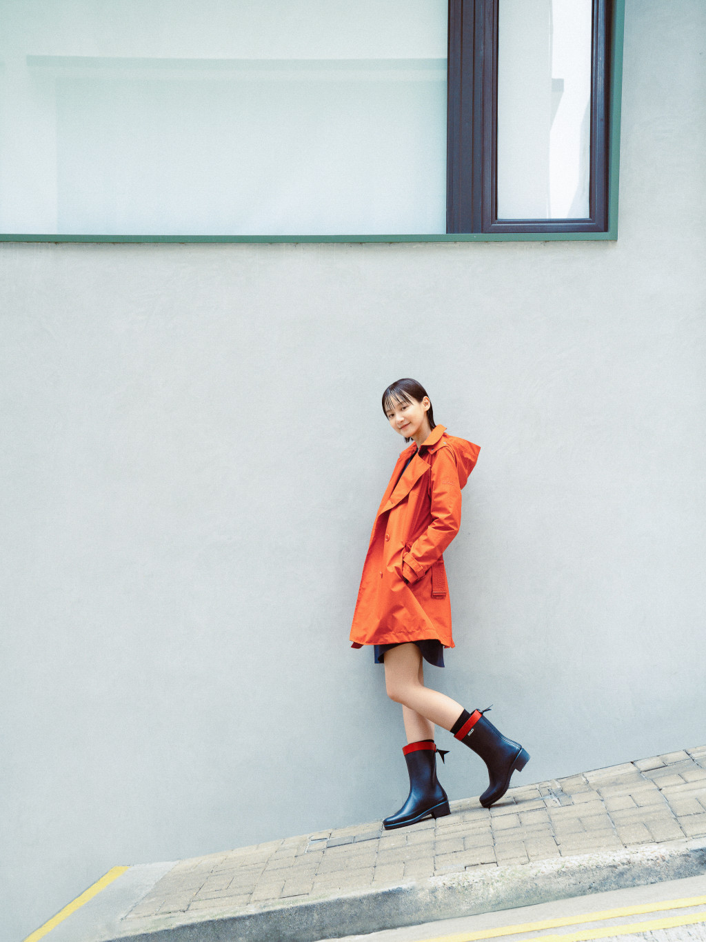 ▲女星袁澧林以具防水、防水及透氣功能的橙色Gore-Tex干濕衫/$4,280,配搭法國制手工Myrica中筒天然橡膠靴/$1,680,造型優雅。 (Aigle)