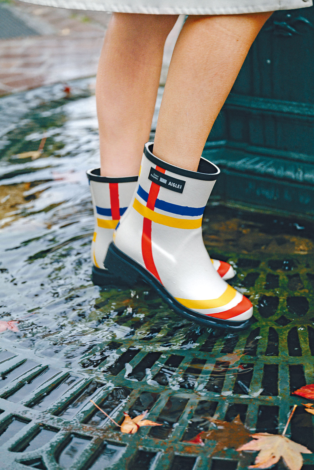 ▲法國制手工天然橡膠女裝靴/$2,280,靴身飾以荷蘭藝術大師Piet Mondrian名作《New York City》的色彩線條圖案。 (Aigle)