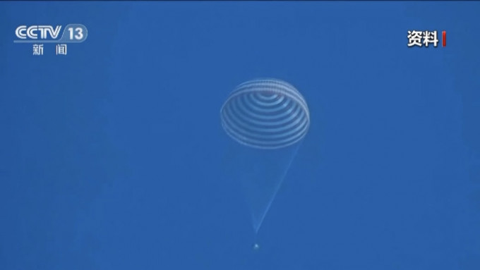 ▲神舟載人飛船返回艙靠降落傘安全著陸。 央視截圖