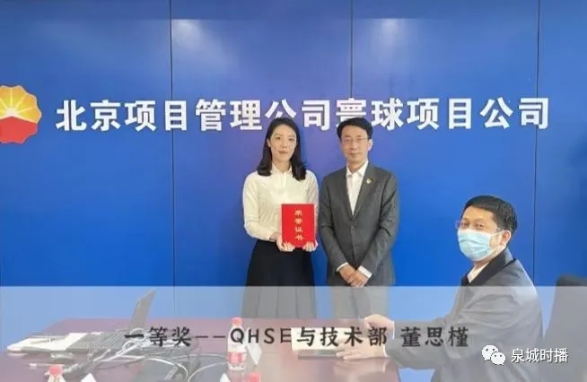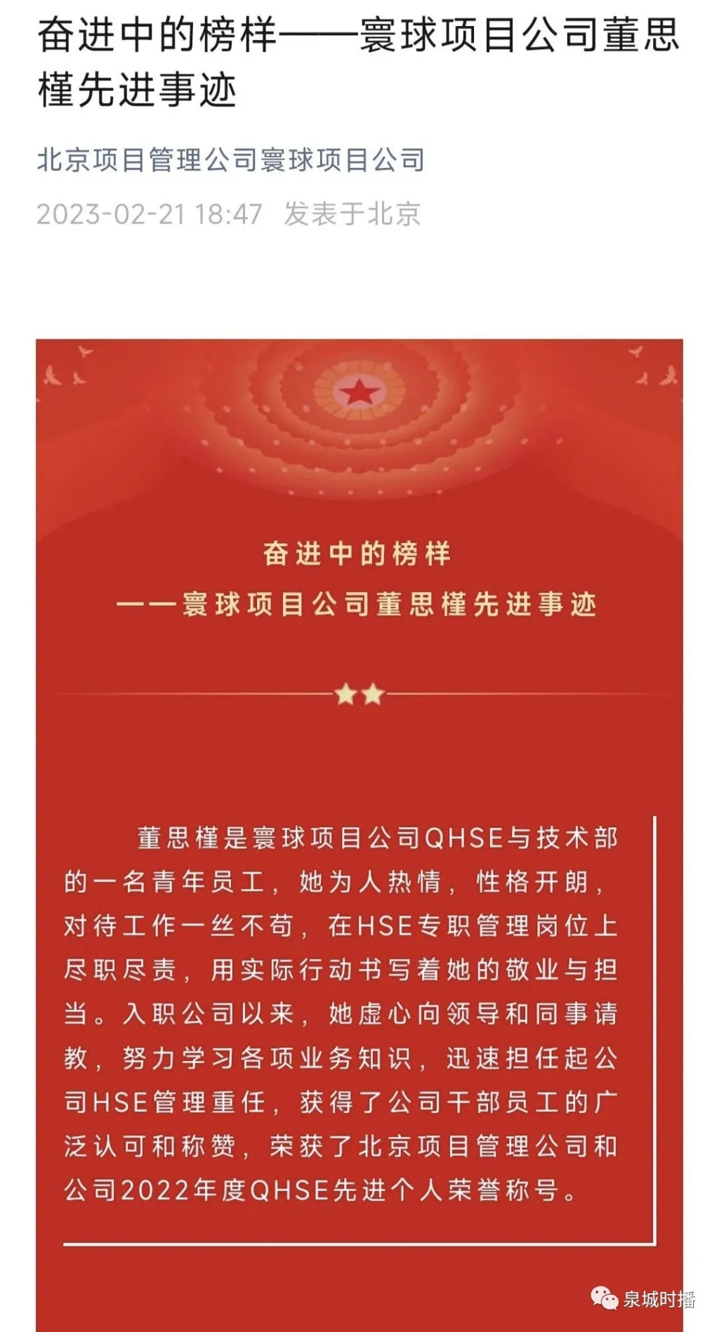 至于工作表現方面,今年2月21日,董思槿曾被公司以“奮斗中的榜樣---寰球項目公司的董思槿先進事跡”為題的文章點名稱贊。文章指“董為人熱情,性格開朗、對待工作一絲不茍”、“獲得公司干部員工的廣泛認可”,因此董獲“北京項目管理公司和公司2022年度QHSE先進個人榮譽稱號”。網更流傳張疑似由張繼勇向董思槿頒獎的相片。