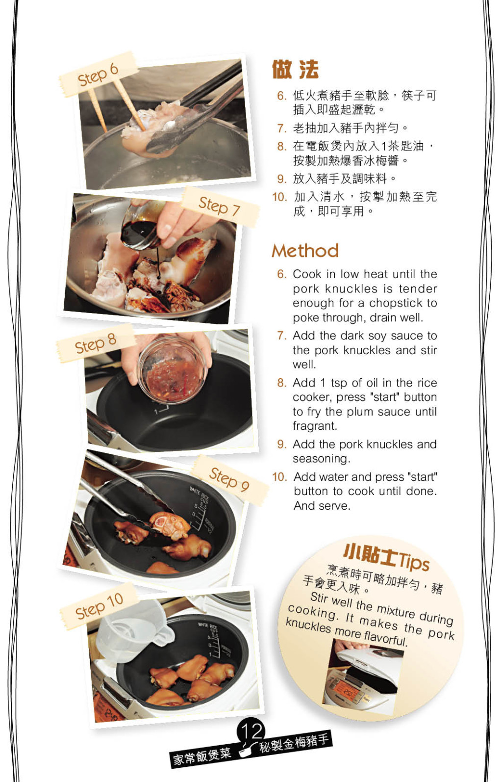 烹調這3款電飯煲家常菜,基本步驟相同,須先預備食材,然后在電飯煲燒熱油,爆香醬料,再按次序加入食材及調味料,按開關煮熟即可。好像惹味的“酒香蔥燒肉”,以姜、蔥、果皮及紹興酒提香,五花腩軟糯入味。夏季正值通菜旺季,以電飯煲炮制的“勁蒜蝦膏通菜梗”,先爆香蒜肉及蝦膏,再下通菜梗煮至香軟,惹味好佐飯。須慢火燜煮的菜式,最適合用電飯煲烹調。炮制“秘制金梅豬手”,建議選用急凍豬手入饌,因急凍貨色較新鮮豬手少碎骨,調味方面,特別選用配搭燒鵝的冰梅醬,以中和豬手的油膩,再以紹興酒增添風味。
