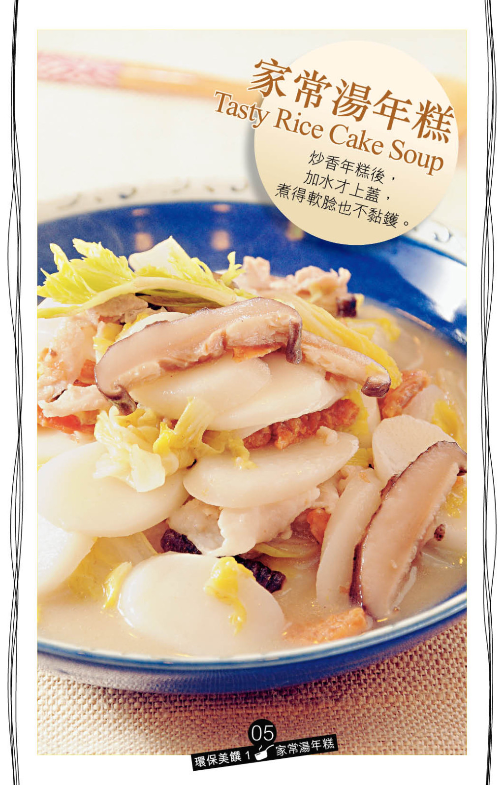 不少人喜歡口感煙韌的上海年糕,這道“家常湯年糕”做法十分簡單,用蔥頭起油鍋,爆香預先浸發的蝦米、冬菇,再加入肉片及黃芽白炒勻,加水煮成湯,然后下年糕煮熟即可。講究一點,可以金華火腿、上湯代替肉片及清水,亦可以改用韓國年糕。西式通粉湯味道酸香,特別開胃。