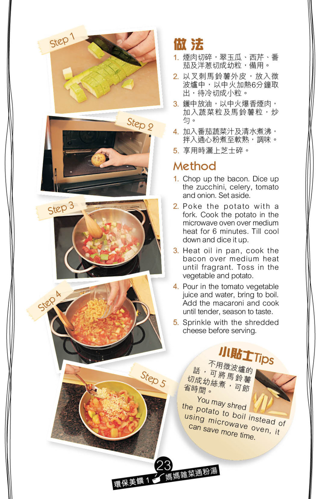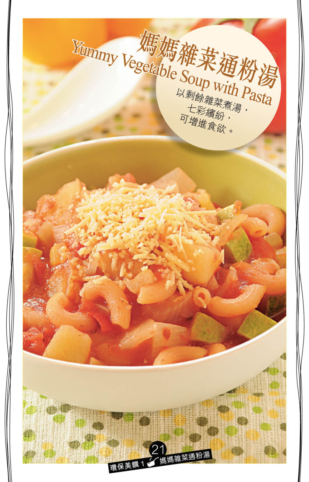 顏色漂亮的“媽媽雜菜通粉湯”,可選用不同蔬菜、瓜類炮制,如西芹、番茄、燈籠椒、翠玉瓜等,為減省工序,可選用罐頭番茄蔬菜汁作湯底,想吃得更健康,可以番茄、蔬菜、肉片煮湯,通粉則宜選蜆殼粉、蝴蝶粉、通心粉等可掛湯的款式。
