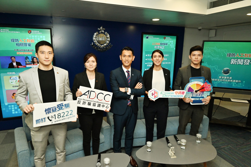 ▲網絡安全及科技罪案調查科網絡安全組警司陳純青(中)聯同四位新委任的“防騙刑警”呼吁市民提防人工智能(AI)相關騙案。四位防騙刑警為張文瀚(Ray)、梁珮筠(Christine)、吳柏慧(Victoria)及陳智穎(Tyler)。