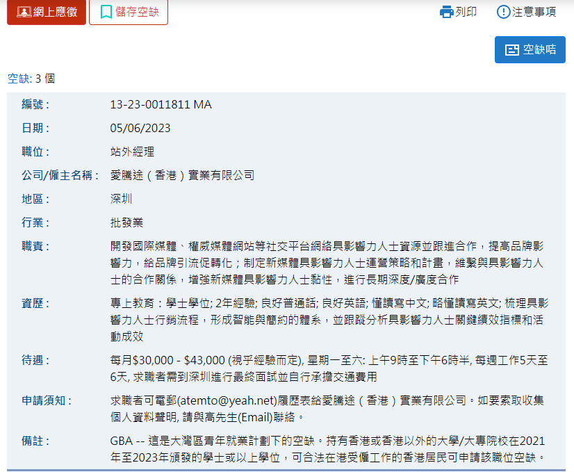 港府今年3月起恒?;按鬄硡^青年就業計劃”,參與的企業須按照香港法例,以不低于月薪18,000港元,聘請合資格畢業生,并派駐他們到大灣區內地城市工作。記者嘗試瀏覽該就業計劃的網頁,發現有不少筍工,例如一間批發業公司聘請的深圳站外經理,月薪可達43,000港元,只要有2年工作經驗、持學士學位就可申請;亦有深圳采購公司聘請會計師,薪酬最高可達60,000港元;另有創科公司招聘研發工程師職位,學歷要求學士學位,月薪達24,000港元。至于18,000港元的工作,就各行各業都涵蓋,例如公關主任、助理工程師,以及銀行業務員等。