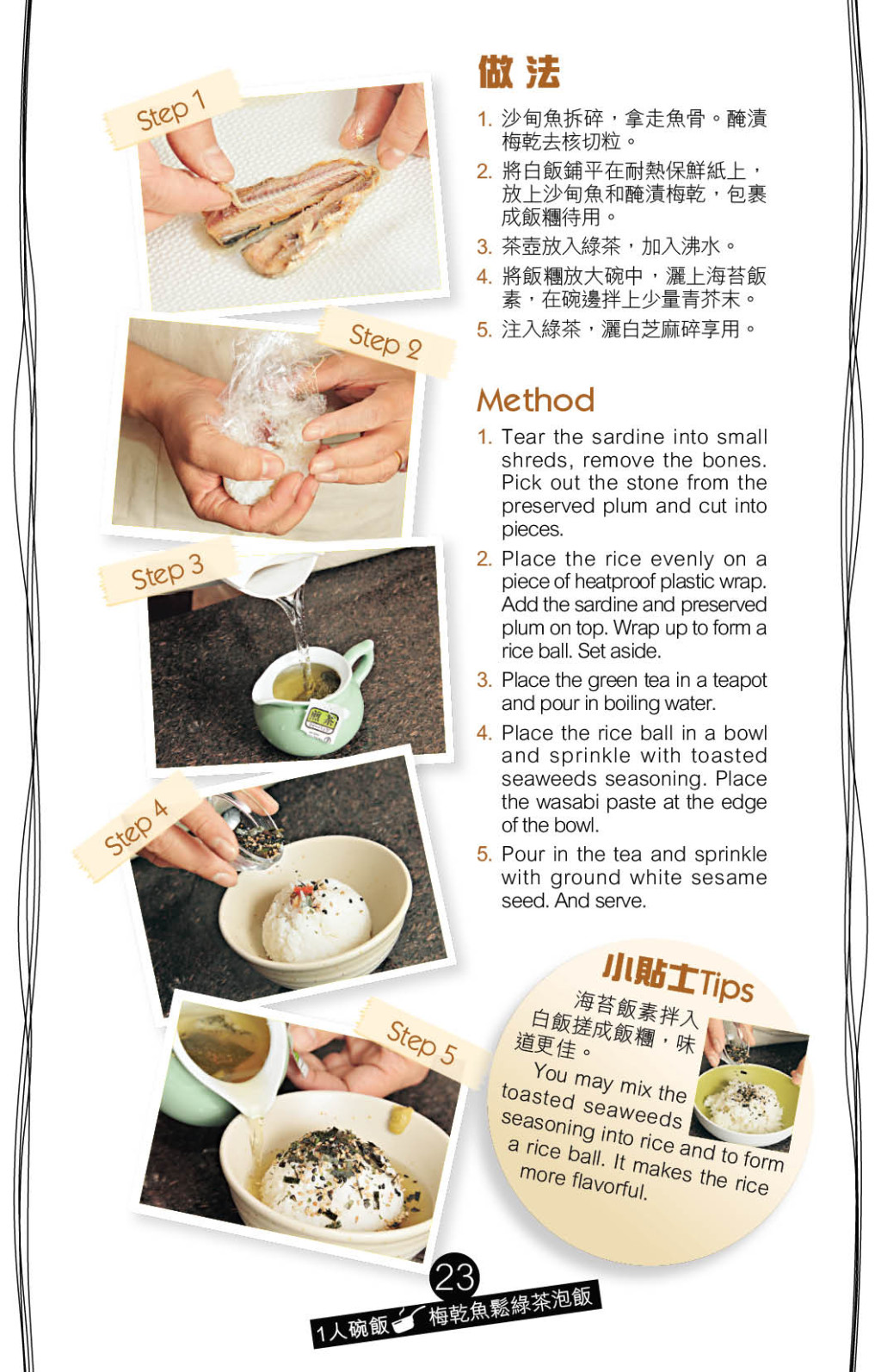 ▲將飯團置碗中,加入海苔飯素及芝麻,再注入泡好的綠茶,吃時伴點青芥末,口感鮮爽不膩。