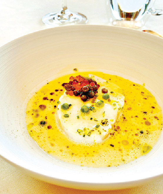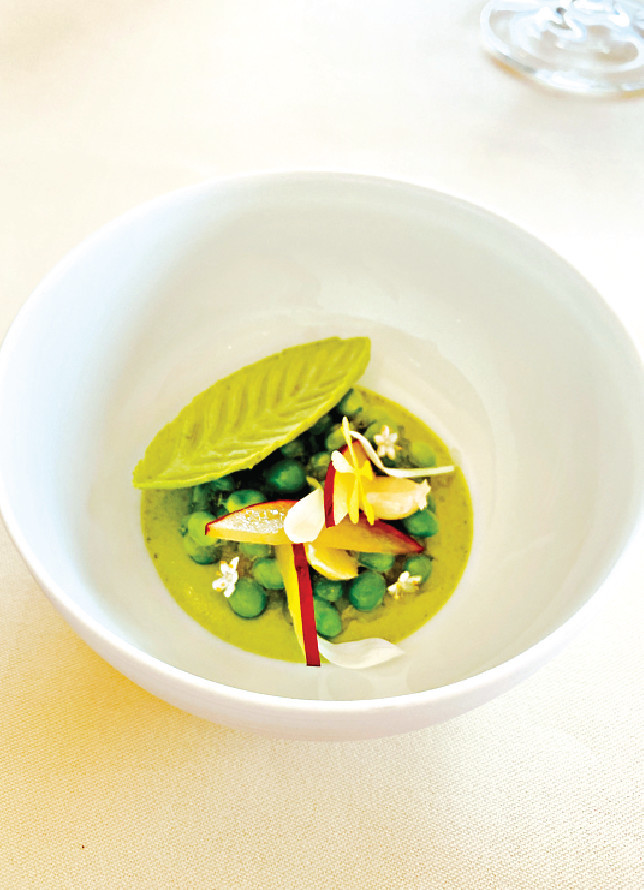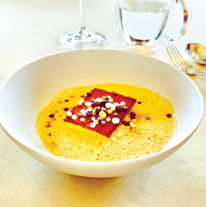 下一道菜Turbot, Capres et Sapin,沿用線釣比目魚入饌,肉質緊緻味道淡雅,還增添線釣魚穫獨特的鮮甜,佐以微酸的小酸豆及柑橘魚子醬,以及香滑而附果仁香氣的朝鮮薊汁提鮮。接下來的招牌Biscuit de Saint Jacques,沿用鮮甜而肉質豐厚的北海道帆立貝入饌,并將之化身帶子蓉,佐以輕盈細滑而Foamy的檸檬香蜂草汁,風味獨特。