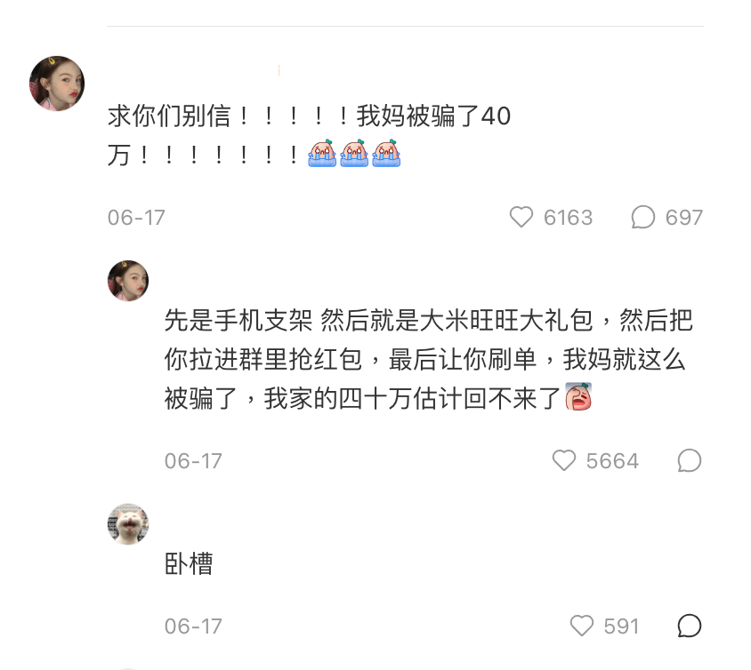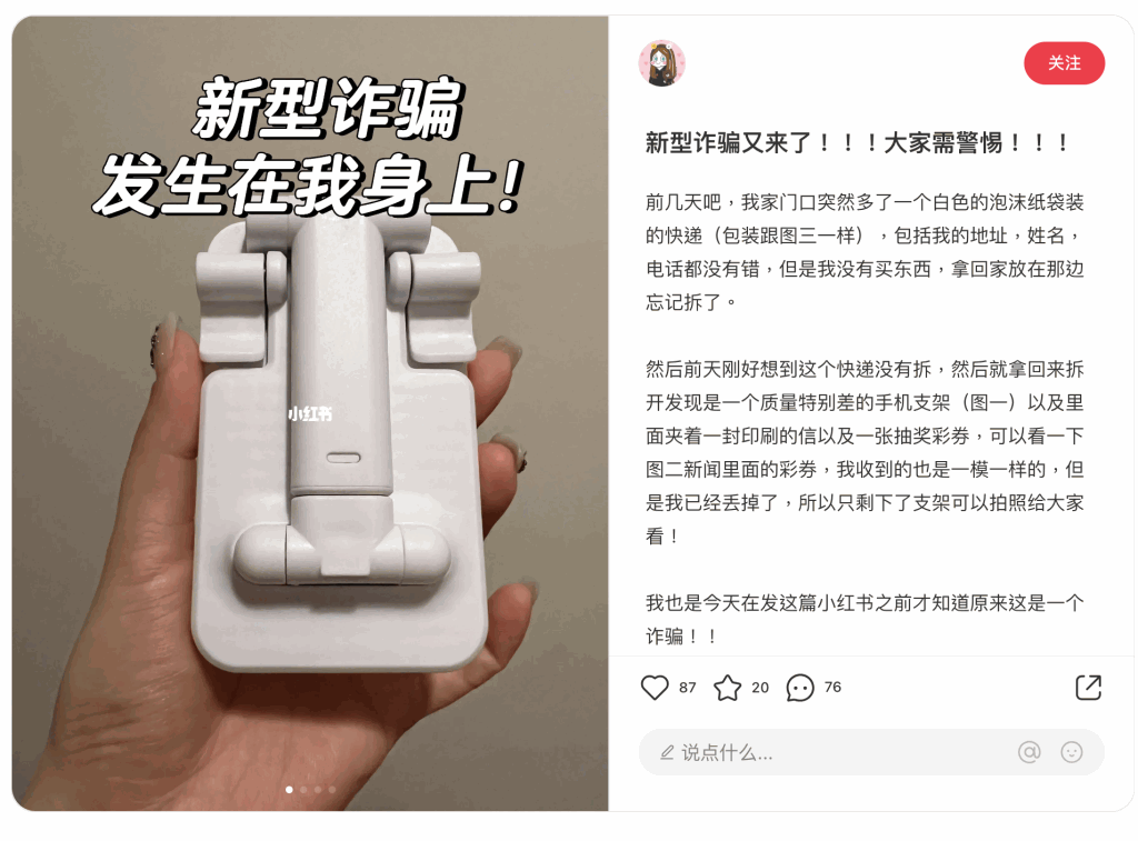 近日有大量網民在內地社交平臺“小紅書”分享,指自己離奇收到陌生人送來的速遞包裹,打開是一份小禮物,有的是手機支架,有的是水瓶水杯,亦有的是紙巾盒,全部都是實用的小物品。 同時包里會有一張刮刮樂抽獎券,刮開后會聲稱已經中獎,要求中獎者嘟二維碼聯絡領獎。 雖然速遞包裹里的小禮物的確是免費,但萬一掃了二維碼,就有機會被騙,有網民的親人更因此損失了40萬人民幣。