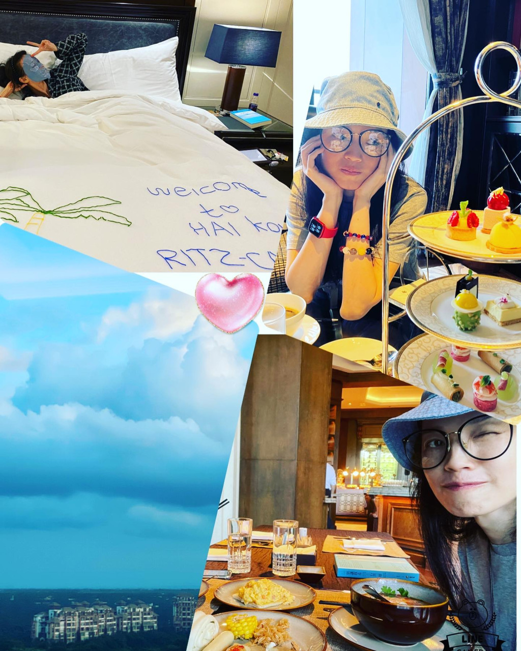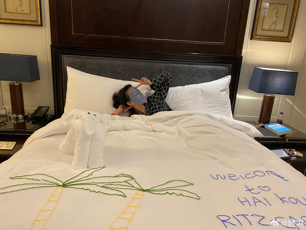 而舒淇未有提及與誰人撐枱腳,但開餐時見到眼鏡反射對面的人穿白色衫,估計其夫馮德倫。舒淇寫道:“好不容易放了個假,酒店1日游,吃飽喝足、睡覺,晚安安唷”。舒淇除嘆下午茶外,又在房內打卡,她躺在布置好的床上,擺出多個姿勢,其中一張更是敷Mask相,完全放棄女神形象。