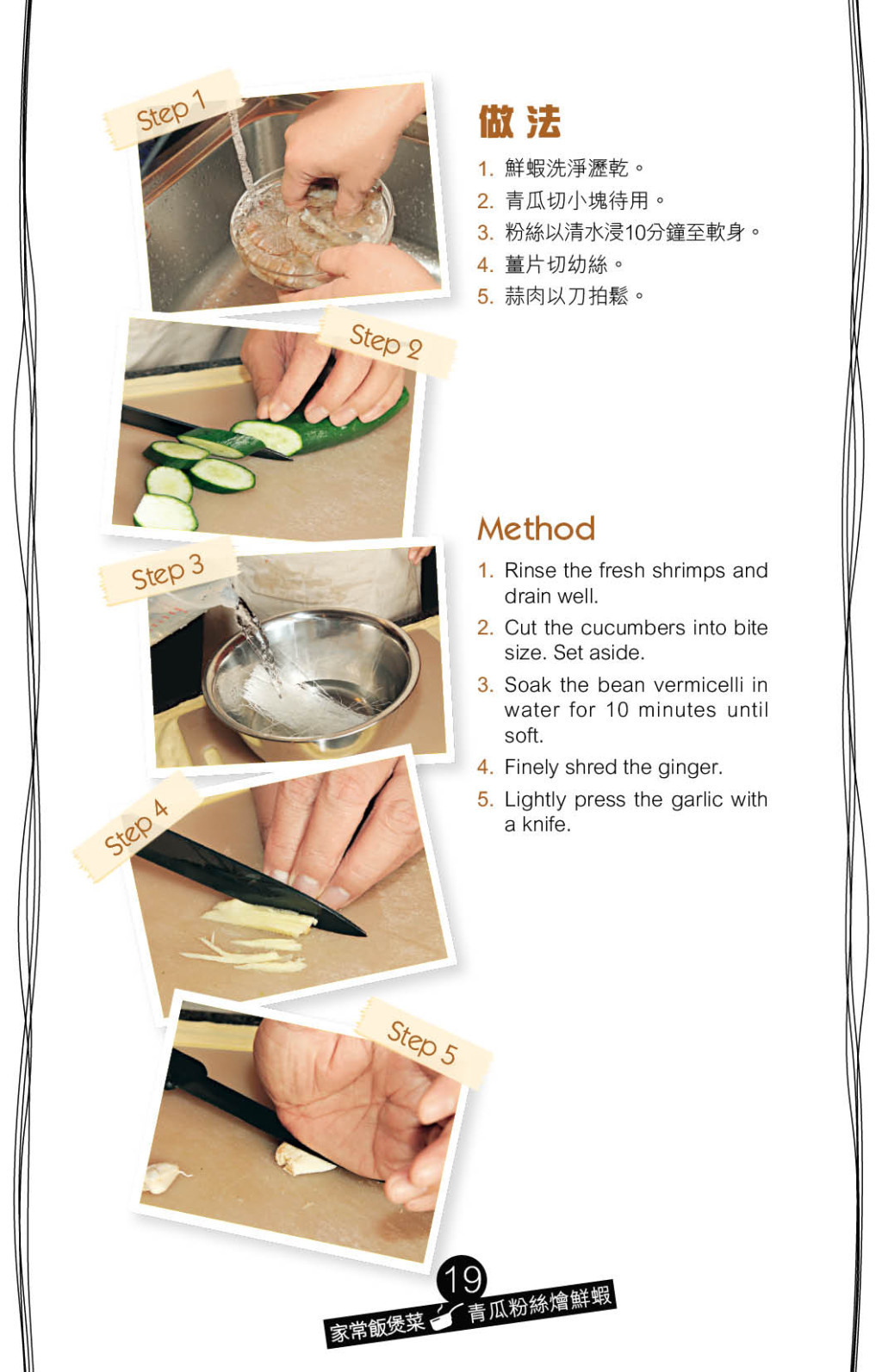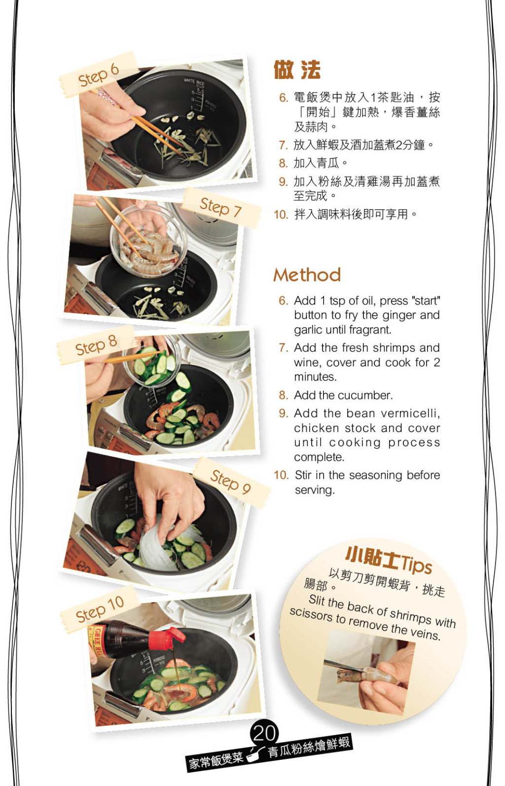 用電飯煲煮“青瓜粉絲燴鮮蝦”,選游水海蝦或冰鮮蝦均可,質感同樣爽脆,加入姜片及紹興酒可去除蝦腥味,粉絲吸了蝦鮮味及調味料的香氣,十分美味。