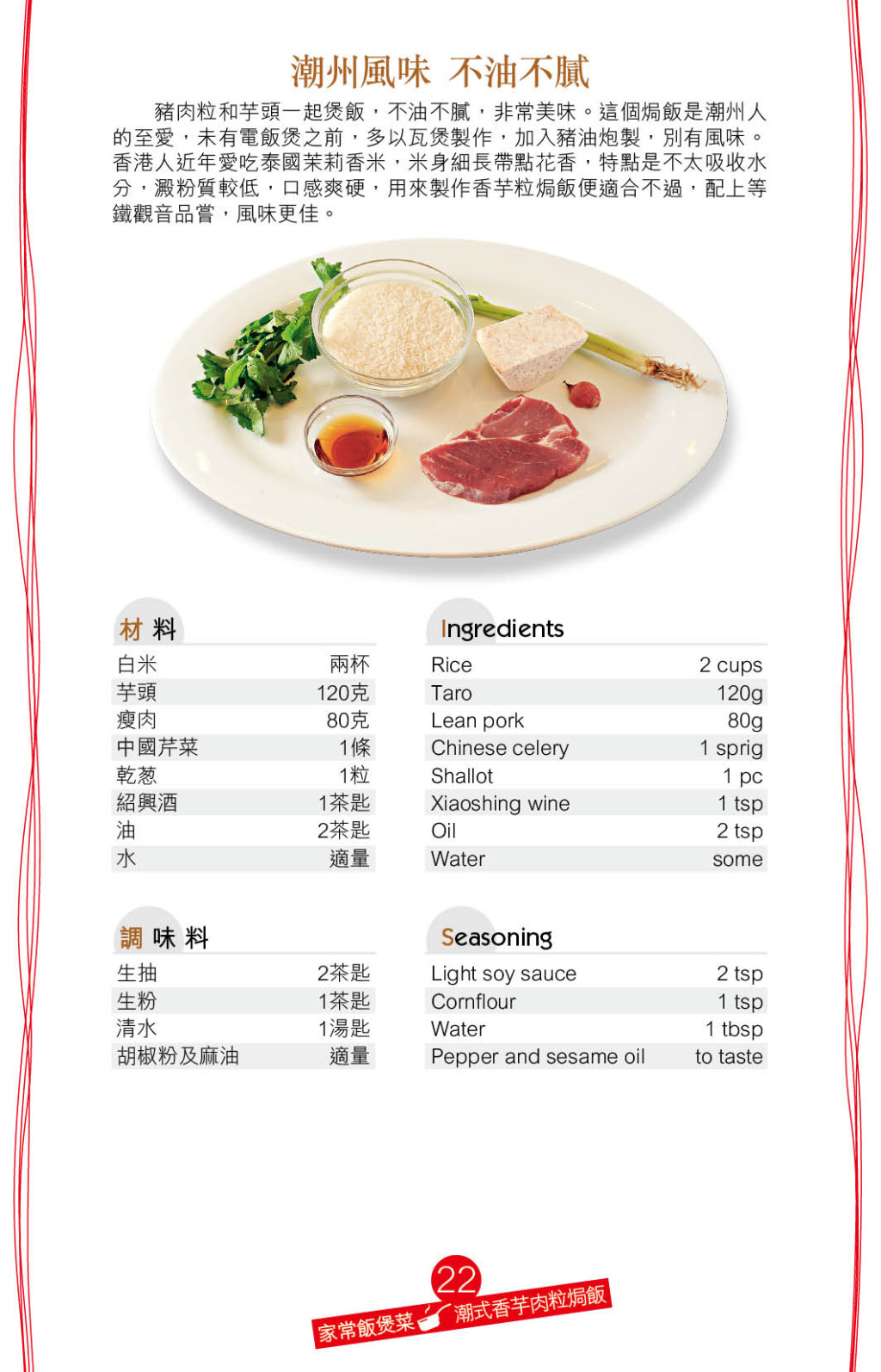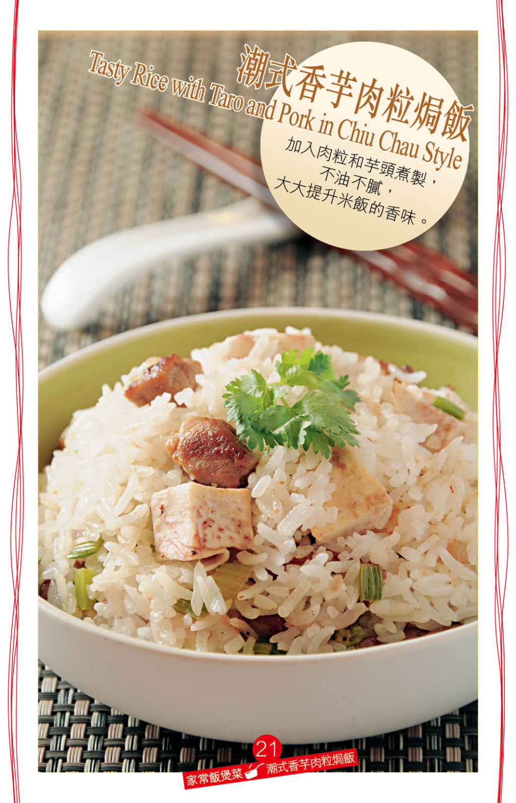 用電飯煲做焗飯及燜飯,比用明火更容易。 “潮式香芋肉粒焗飯”啖啖芋頭和芹菜香氣,想令香味更豐富具層次,建議再加入爆香的冬菇粒和蝦米,并多花一點工夫,先炸芋頭至金黃才加入米飯中煲煮。