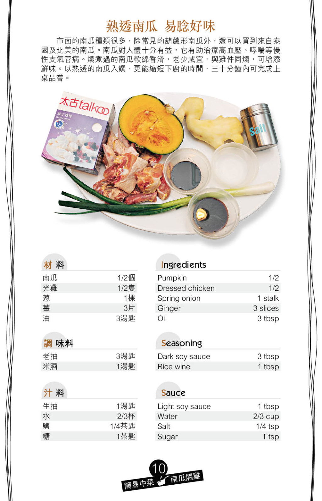 生南瓜質感結實,但容易煮腍,不用費時烹調。南瓜很適合配搭肉類入饌,清甜南瓜香可為肉類增添香甜味道。喜歡吃雞,必試“南瓜燜雞”,用姜和蔥爆香雞件及南瓜,灒酒提升香氣,配搭簡單調味料,燜煮至雞肉入味及南瓜軟腍便可上碟。