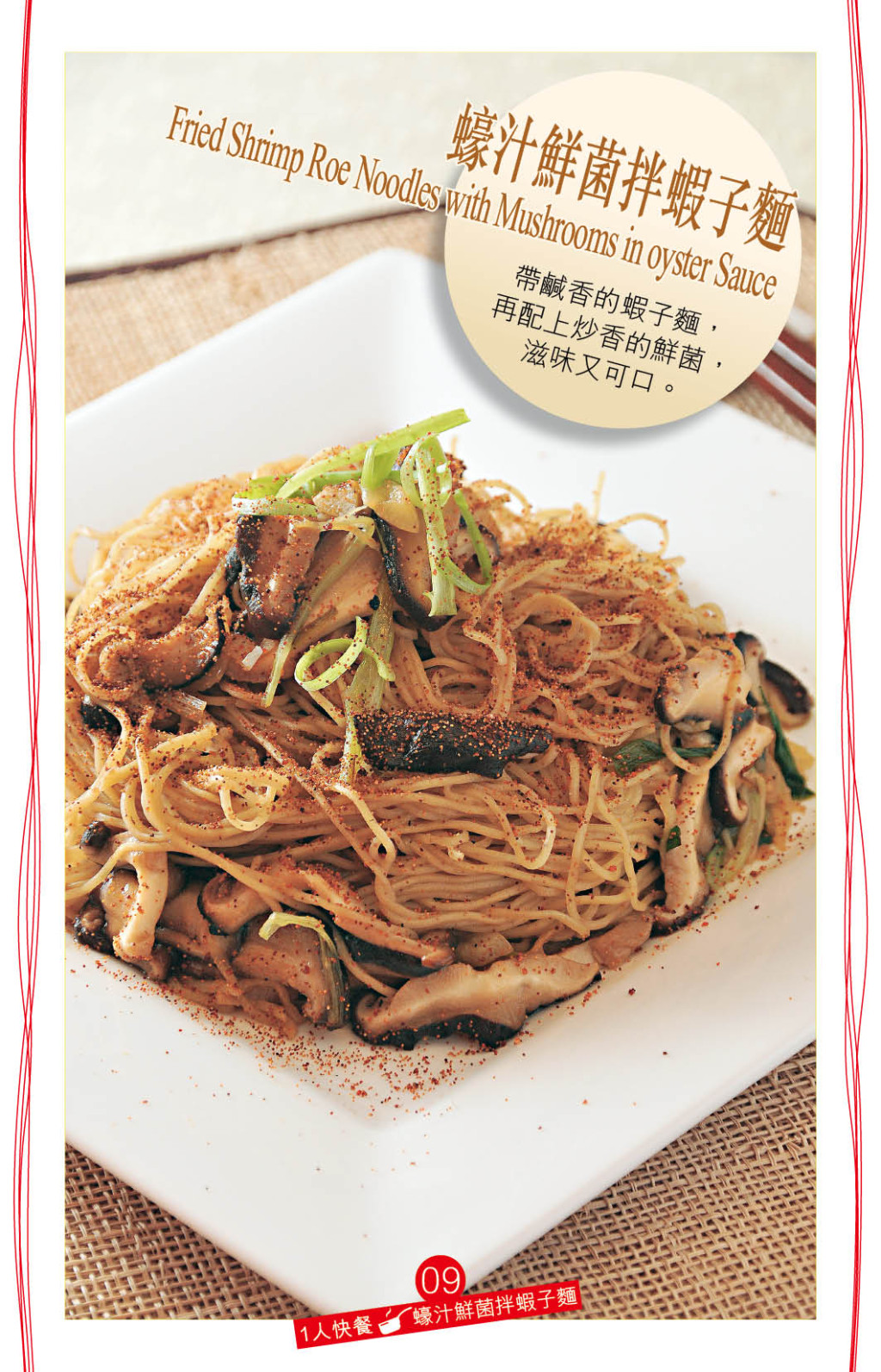 家人喜歡面食,不妨做“蠔汁鮮菌拌蝦子面”作為午或晚餐,簡單以姜、蔥及蒜爆香鮮菇菌,加入灼熟的蝦子面及蠔油等調味料拌勻,再灒紹興酒添香氣,最后撒上蝦子提升鮮味。