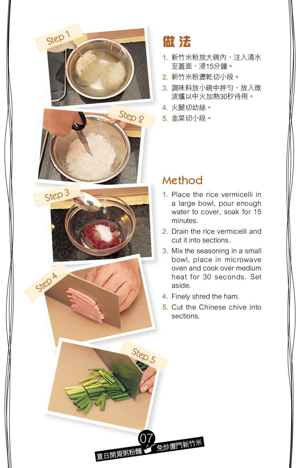 主食當中,米粉的質感最爽口。今日教煮的“免炒廈門新竹米”使用微波爐烹調,特別加入五柳甜酸菜、茄汁、蘋果醋調味,令酸甜味道更有層次,味道醒胃。