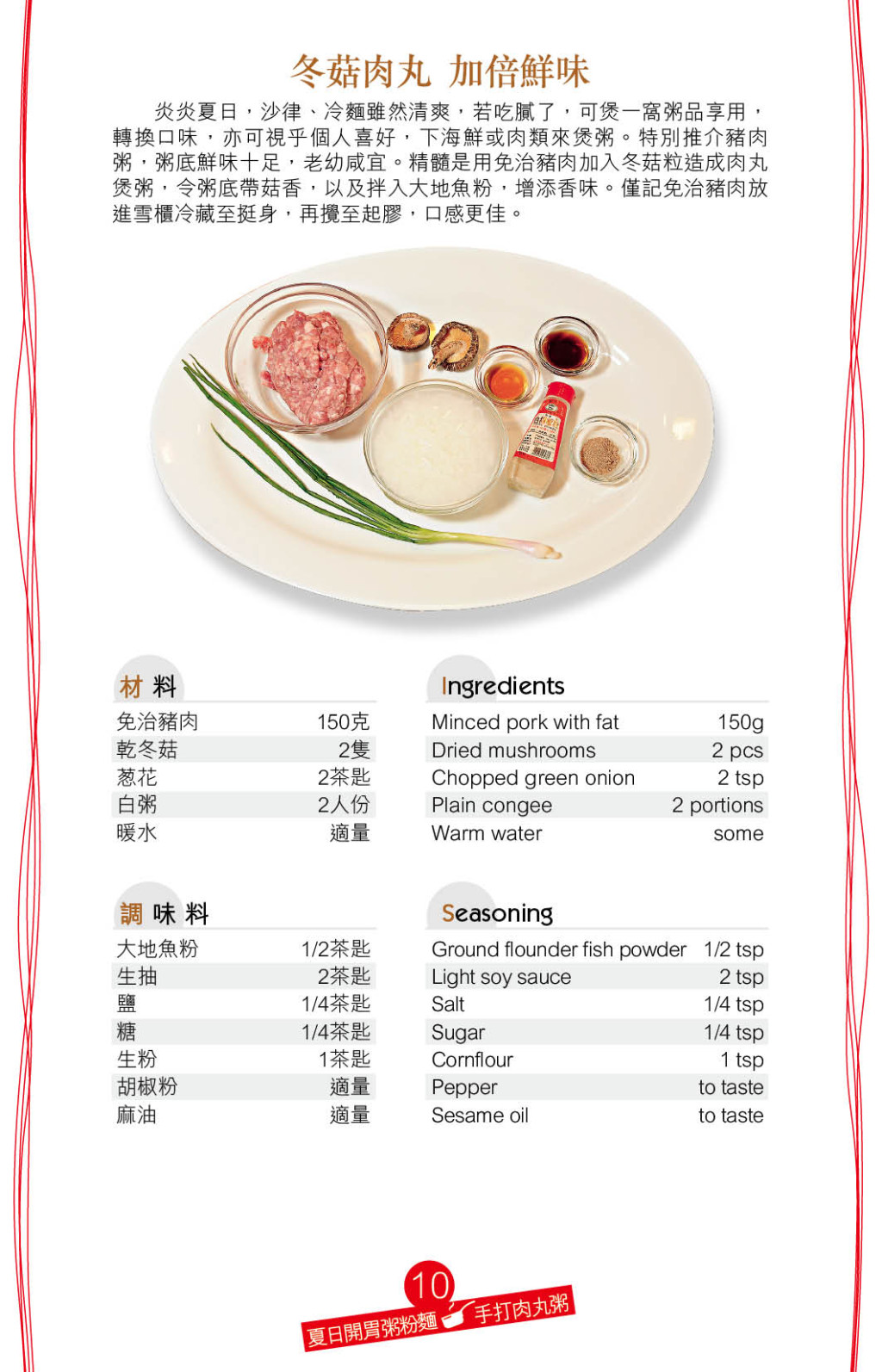 想吃得清淡一點,爽口的“手打肉丸粥”是首選,自制肉丸簡單易做,在現成免治豬肉中加入浸軟的冬菇及浸冬菇水,可豐富鮮味及口感,再加入調味料以順時針攪拌至起膠再搓成肉丸,接著將丸子加入煲滾的白粥中煮熟即可,若想肉丸更富鮮味,可在免豬肉中加入炒香的蝦子及大地魚粉調味。