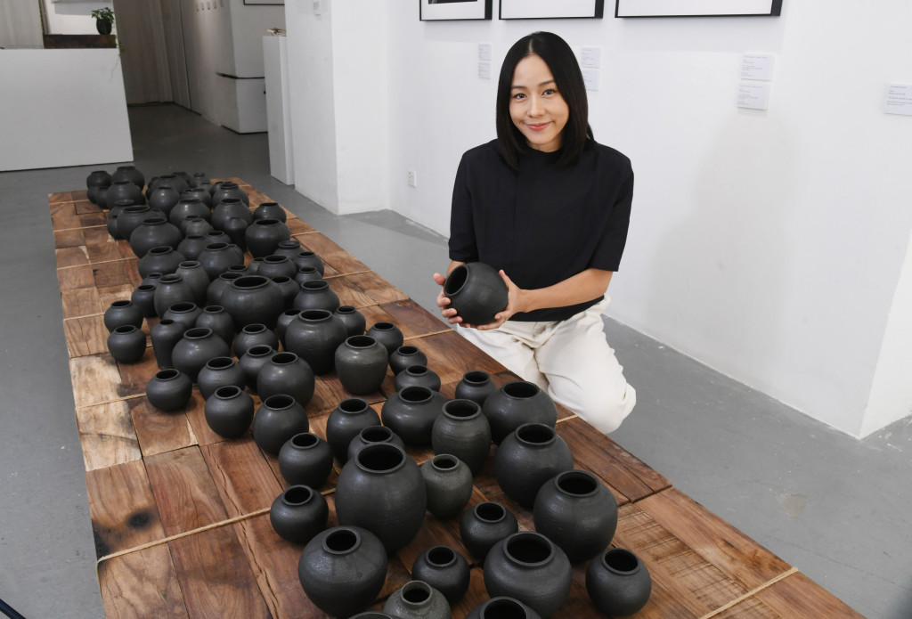 ▲林嘉欣以一百件黑陶器皿,拼合成3米乘1米的裝置作品,猶像一道小河流。