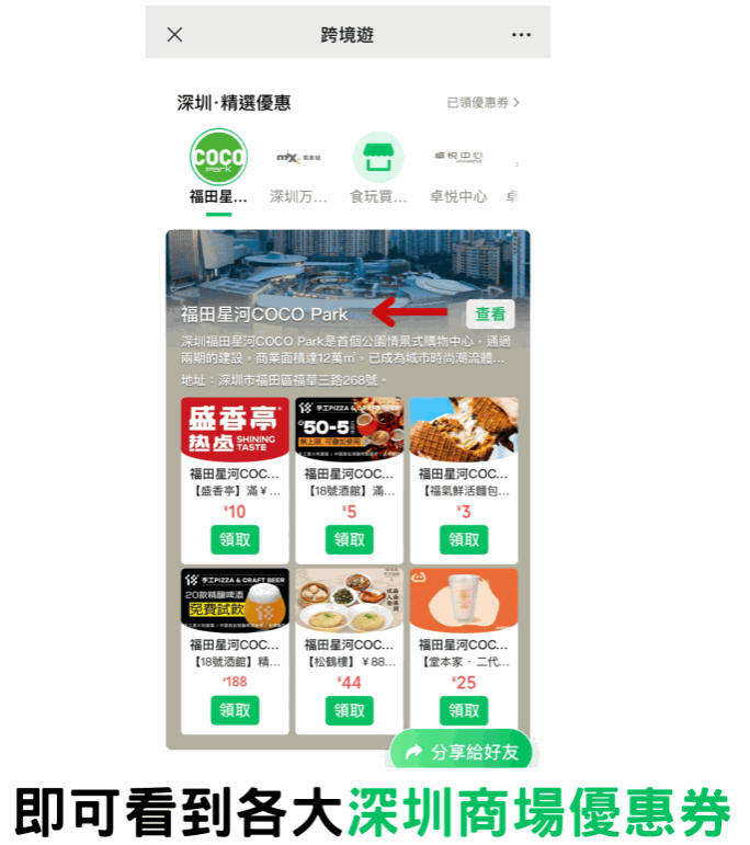 WeChat微信用戶只需點擊“我”,再選擇“服務”,按“跨境游”,進入“商場名字”頁面,即可領取6大商場優惠券,下單時向店員出示優惠券,跟隨指示完成換領或付款步驟即可。深圳商場優惠包括: