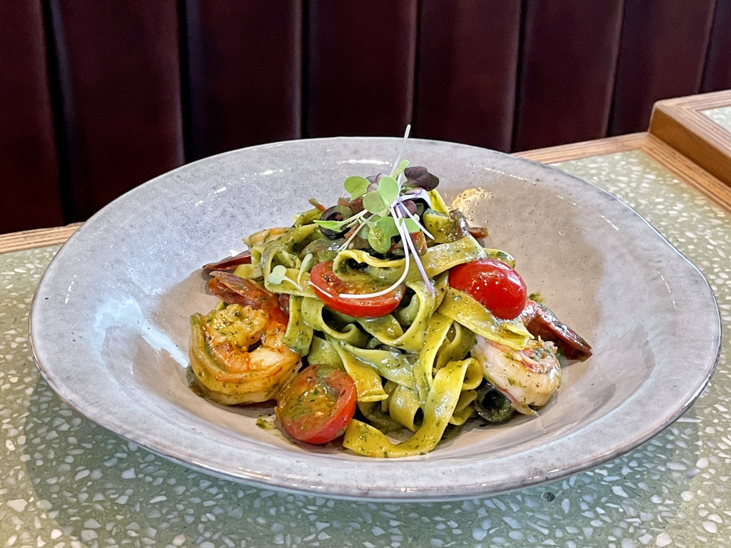 ▲意大利香草醬大蝦闊扁面(HK$158),采用手工闊扁面,口感帶點煙韌,而且富有蛋香,加入了自家調制香草醬。
