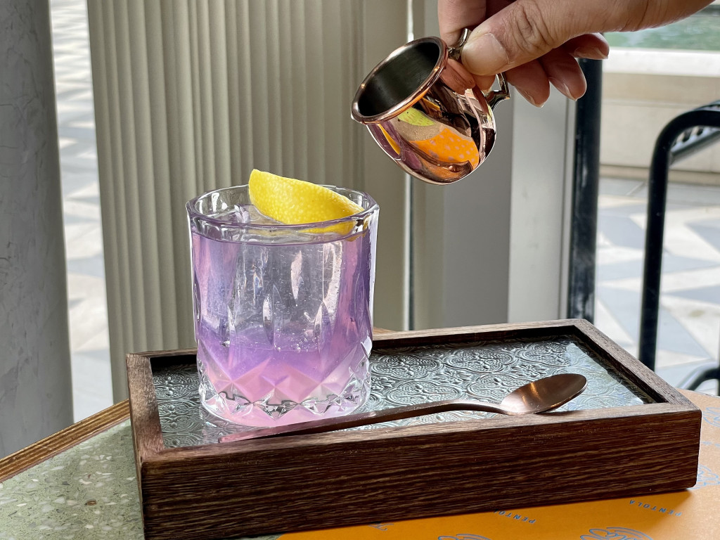 ▲Sweet Dream(HK$98)將蝶豆花加入品牌“白蘭樹下”氈酒,倒入檸檬汁,雞尾酒顏色隨即由藍轉紫,打卡一流!