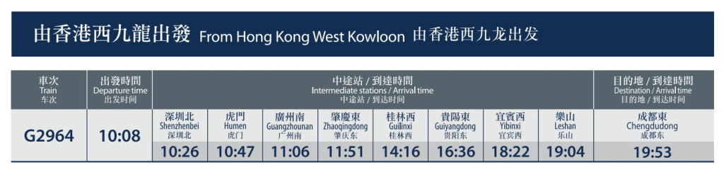 ?G2964 往來成都東站,早上10時08分香港出發,下午2時16分駛經桂林西站
