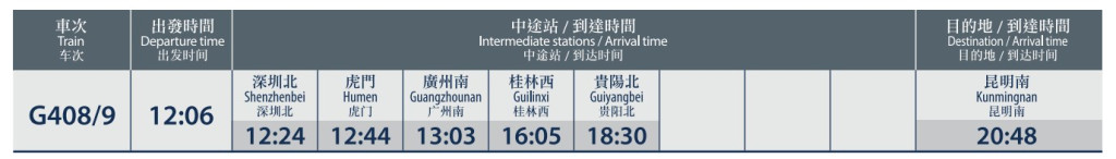 ?G408/9 往來昆明南站,中午12時06分香港出發,下午4時05分駛經桂林西站