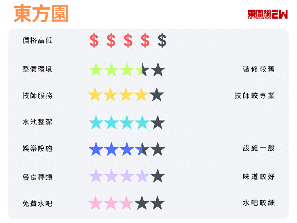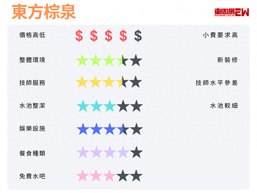 從價格高低、整體環境、技師服務、水池整潔、娛樂設施、餐食種類、免費水吧七大方面評分!看看哪家性價比最高!